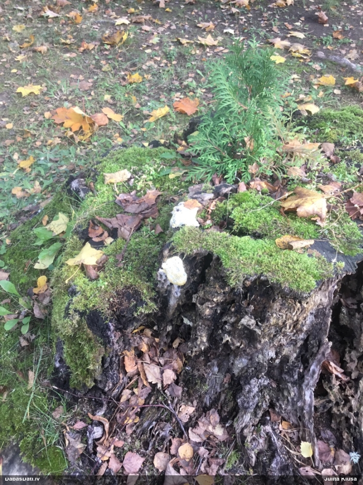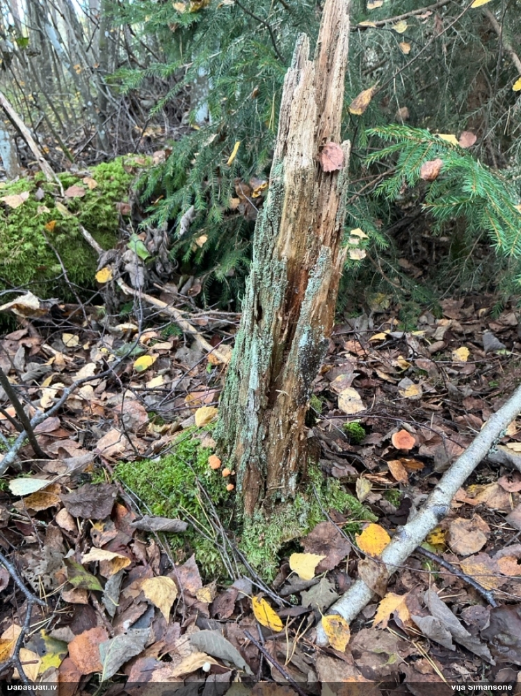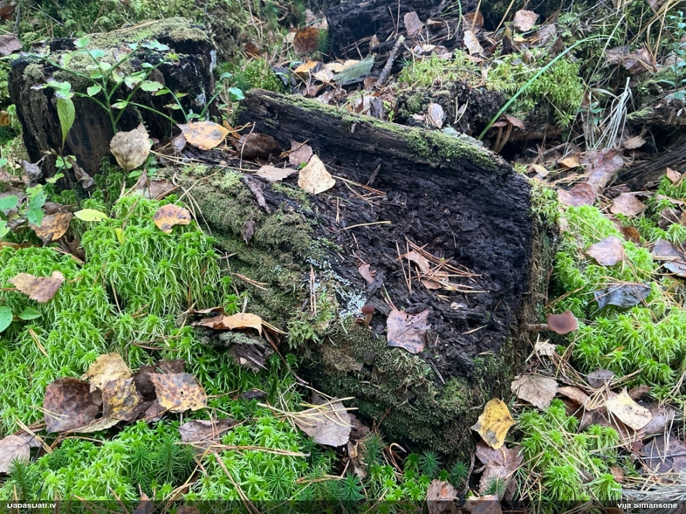 Satrūdējusi kritala mežā, nav dēļi. Iespējams, egle, jauktu koku mežs.
