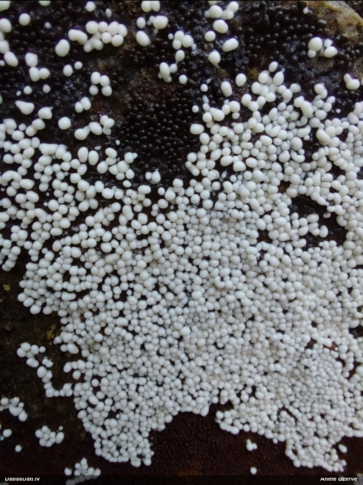 Lai arī Edvīns šo ir skatījis, nesen viņš ir teicis, ka ragansviestus īpaši nav pētījis, turklāt tieši par F.intermedia man stāv atmiņā, ka viņš to vai nu neatzīst, vai īsti nav redzējis, tāpēc pieļauju, ka viņš to varētu arī labi nezināt. Tā kā pati atradu tādu, kas, manuprāt, pēc visām pazīmēm atbilst F.intermedia, tad salīdzināju ar šo, un man izskatās abi ļoti līdzīgi gan pēc iekšējām struktūrām (kā cieši daudzi augļķermeņi kopā sablīvēti), gan pēc sporām (ar izteiktām mazākām un lielāku, treknāku kārpu grupām). Un lai vai kā, šai ir lielākas sporas nekā F.septica tipiski ir (6-9 mkm un 9-11 mkm tomēr nav gluži tas pats, pat ja "9" pārklājas). Un vācu noteicējā tulkojumā par F.intermedia atradumu teikts "Nobriedušas ētālijas bija veidojušās ar vai bez garozas, un pēdējā gadījumā bieži bija rozā krāsā." - un te ir tas rozā gadījums. Turklāt F.intermedia nereti aug uz dzīviem augiem (un sūnas tādas ir). Tā ka es tomēr palieku pie F.intermedia viedokļa.