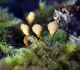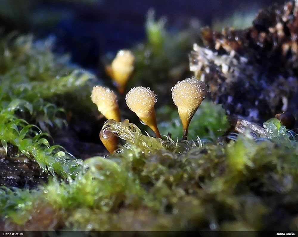 Man pēkšņi radās ideja - vai tur bija nu ļoti mitrs mikroklimats, egle ar melnalksni? Hipotētiski tādas dzeltenas var būt Diachea muscorum. Te bilde ir mazliet līdzīga: https://fr.wikipedia.org/wiki/Fichier:Craterium_muscorum,_Trawscoed,_North_Wales,_Aug_2016_-_Flickr_-_janetgraham84.jpg