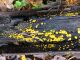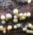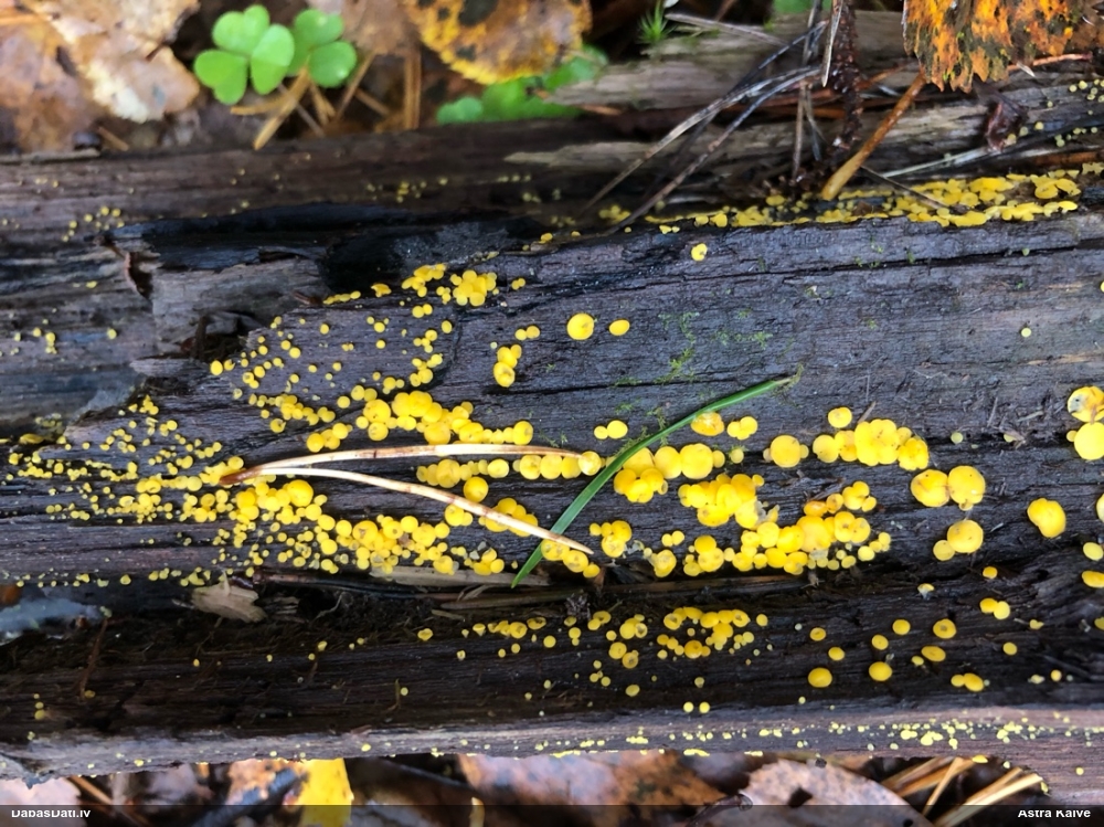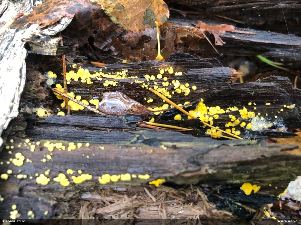 Man pēkšņi radās ideja - vai tur bija nu ļoti mitrs mikroklimats, egle ar melnalksni? Hipotētiski tādas dzeltenas var būt Diachea muscorum. Te bilde ir mazliet līdzīga: https://fr.wikipedia.org/wiki/Fichier:Craterium_muscorum,_Trawscoed,_North_Wales,_Aug_2016_-_Flickr_-_janetgraham84.jpg