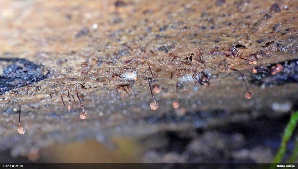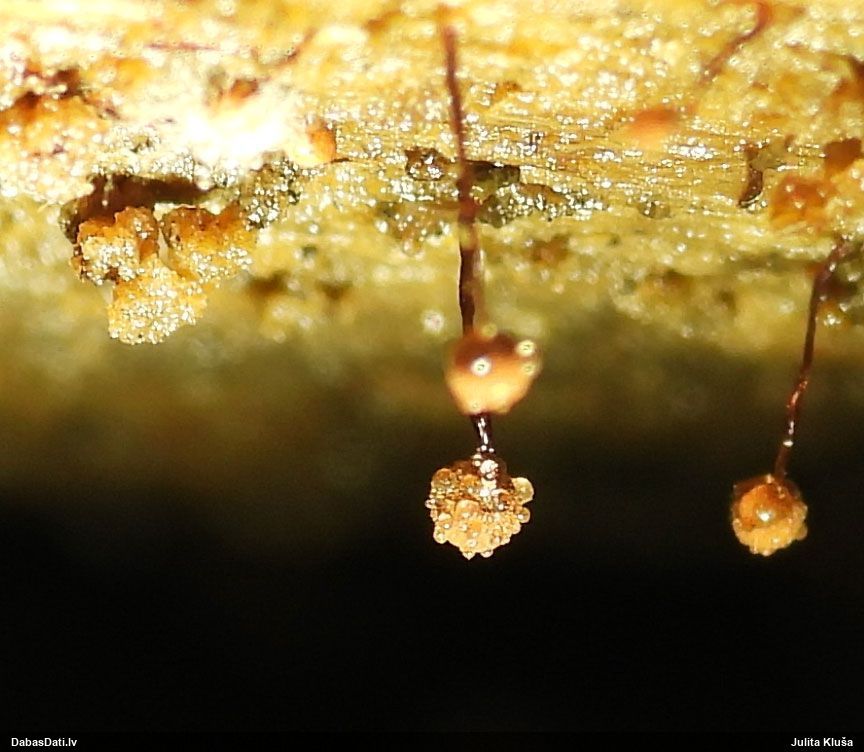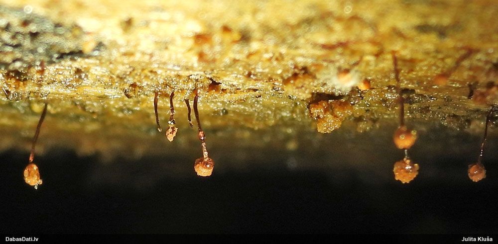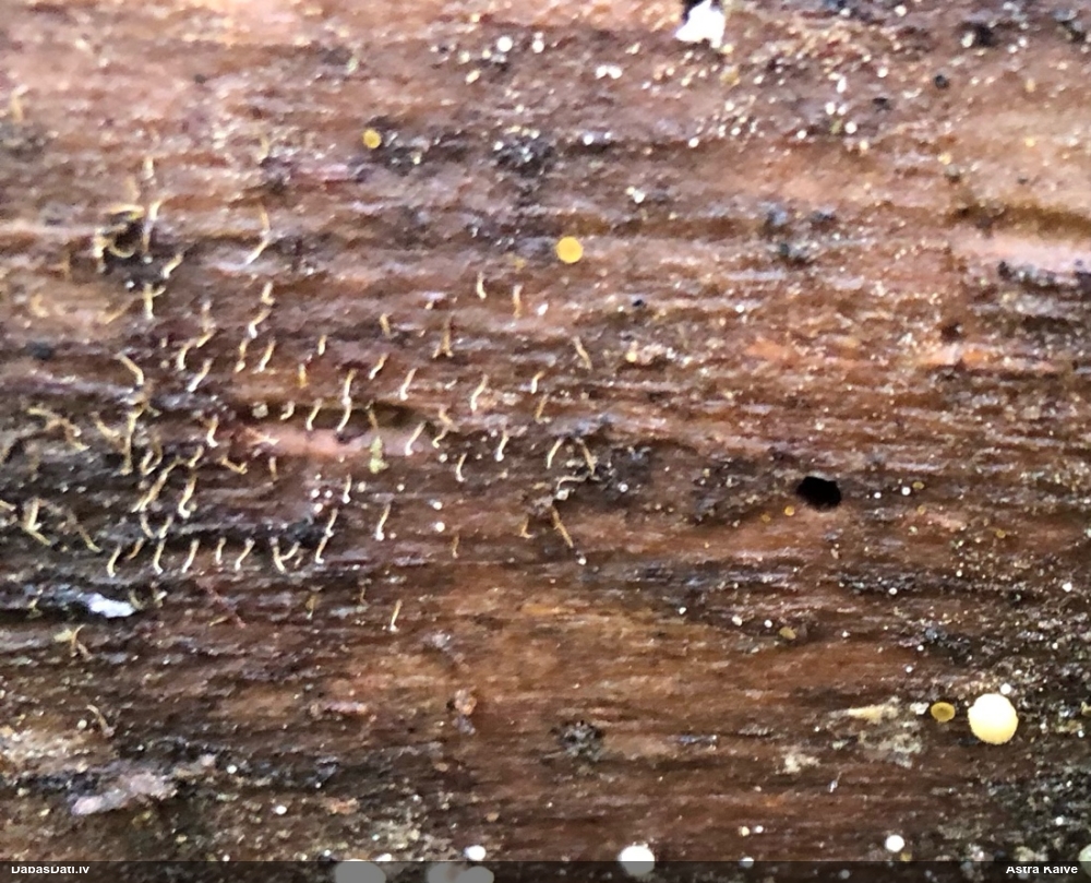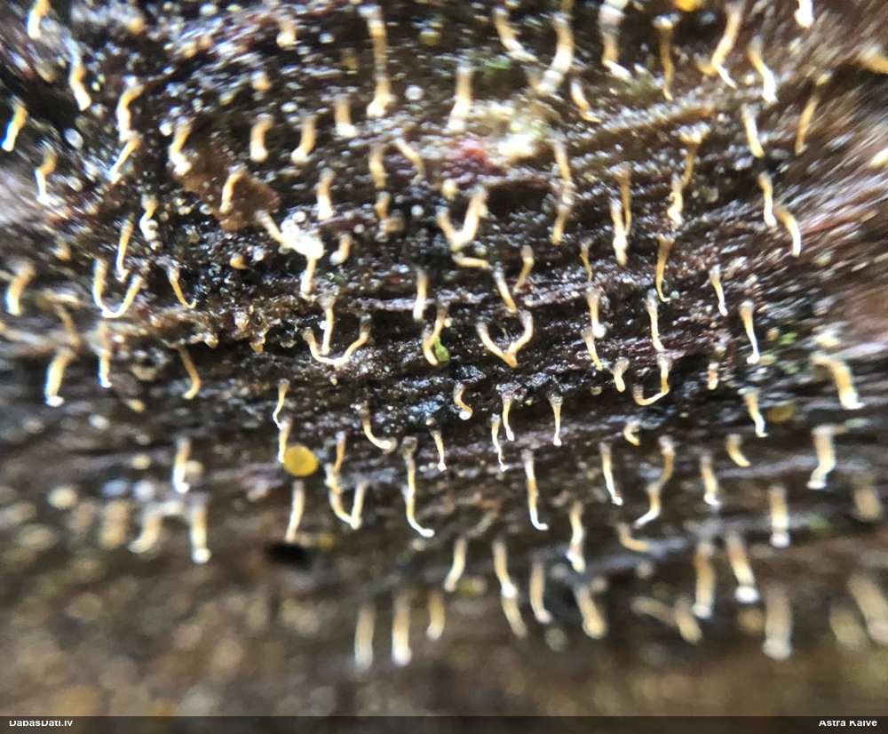 Vai tik nebūs medainā bumbulīte? Augļķermeņi vertikāli izstiepti, sporu mākonis ciešā klājienā.