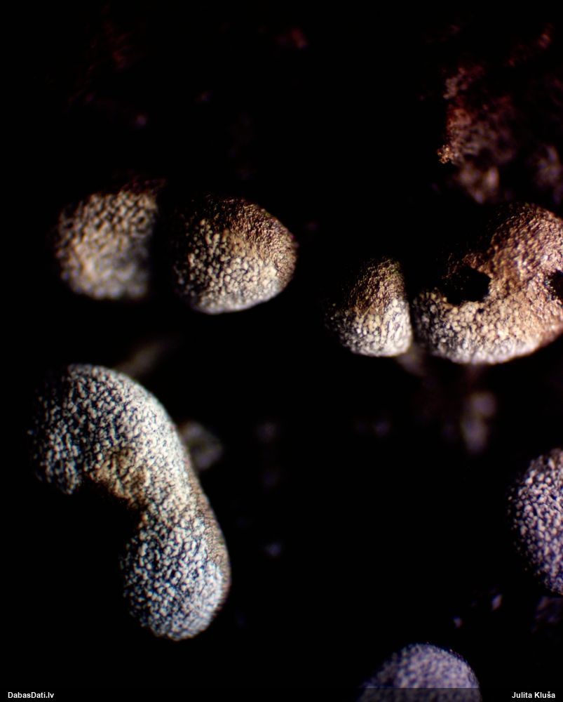 Sporas izskatās ļoti gaišas, varbūt nenobriedušas. Es laikam pēc kāda laiciņa mēģinātu vēlreiz mikroskopēt. Tajā pašā laikā sporu izmēri priekš T.contorta ir pamazi (ja tipiski ir 11-14 mkm, te ir knapi 11 mkm)