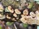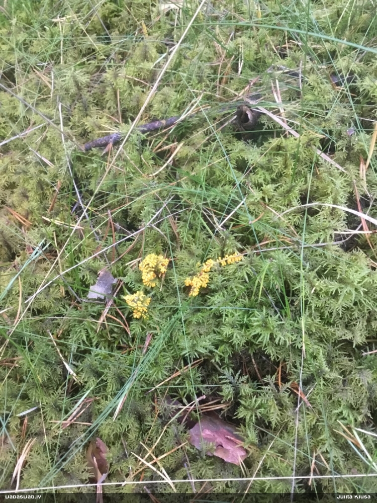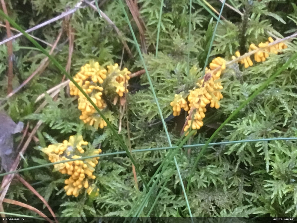 Man pēkšņi radās ideja - vai tur bija nu ļoti mitrs mikroklimats, egle ar melnalksni? Hipotētiski tādas dzeltenas var būt Diachea muscorum. Te bilde ir mazliet līdzīga: https://fr.wikipedia.org/wiki/Fichier:Craterium_muscorum,_Trawscoed,_North_Wales,_Aug_2016_-_Flickr_-_janetgraham84.jpg