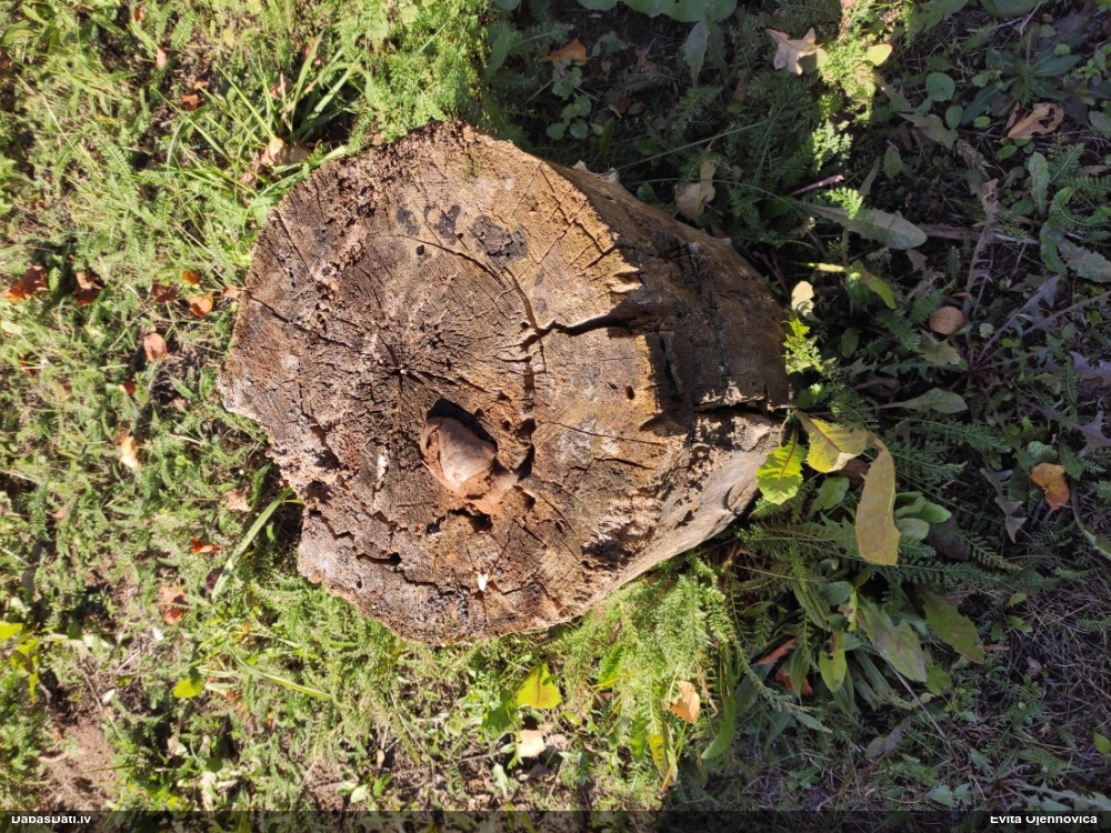 Satrūdējusi kritala mežā, nav dēļi. Iespējams, egle, jauktu koku mežs.