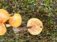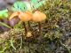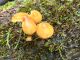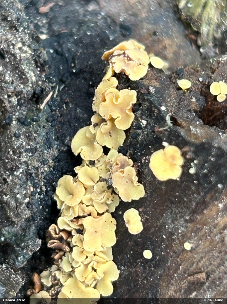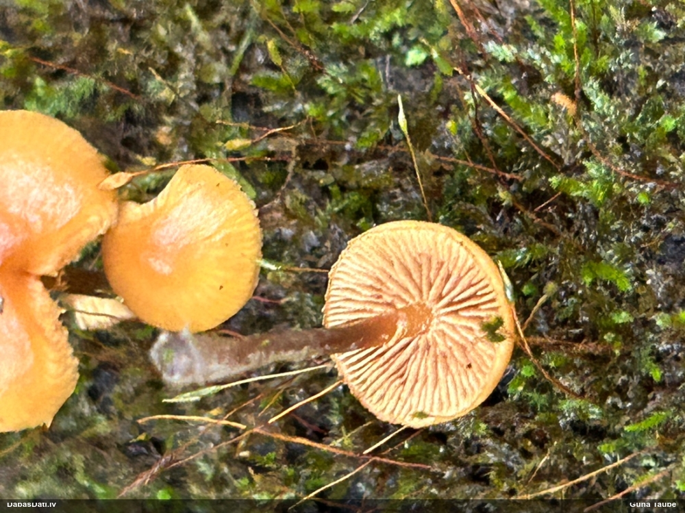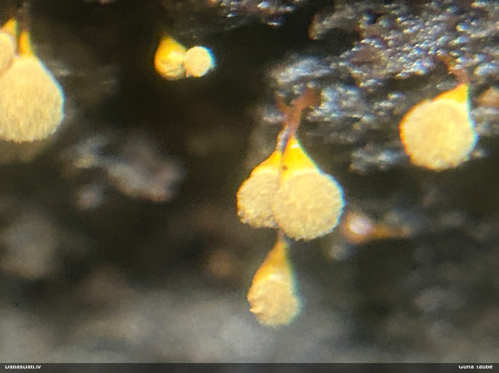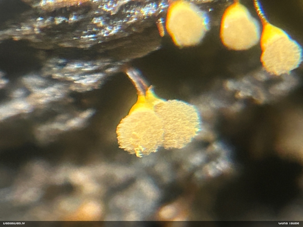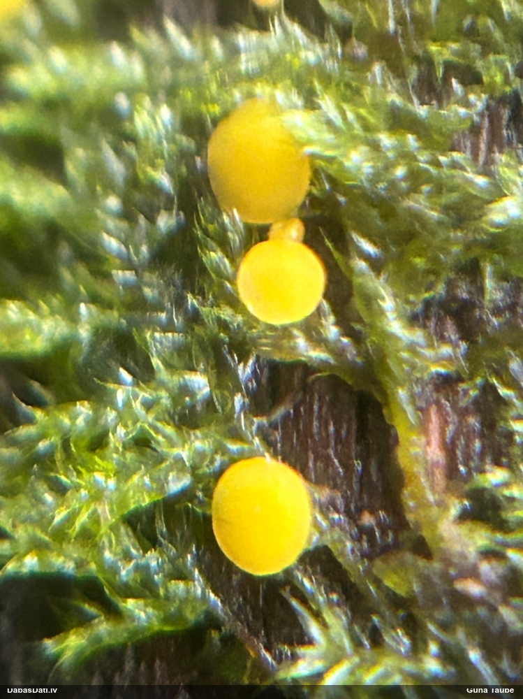 Man pēkšņi radās ideja - vai tur bija nu ļoti mitrs mikroklimats, egle ar melnalksni? Hipotētiski tādas dzeltenas var būt Diachea muscorum. Te bilde ir mazliet līdzīga: https://fr.wikipedia.org/wiki/Fichier:Craterium_muscorum,_Trawscoed,_North_Wales,_Aug_2016_-_Flickr_-_janetgraham84.jpg