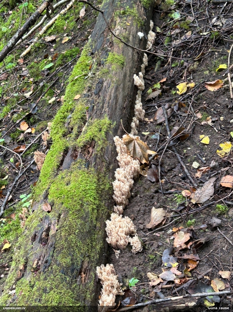 Satrūdējusi kritala mežā, nav dēļi. Iespējams, egle, jauktu koku mežs.