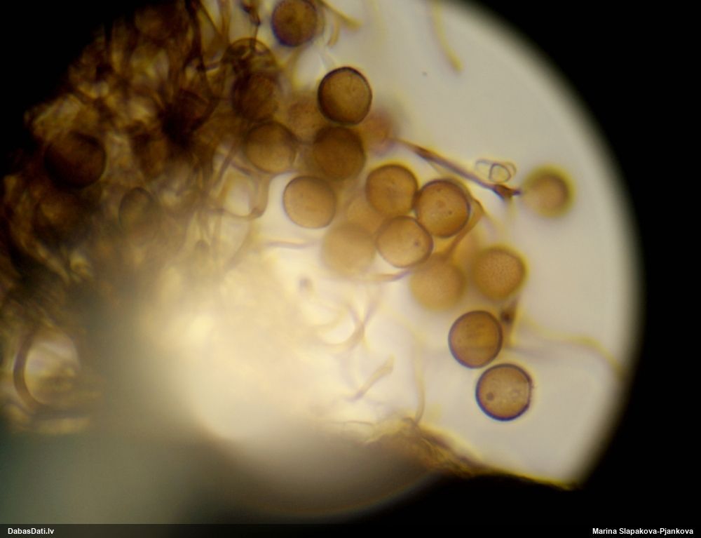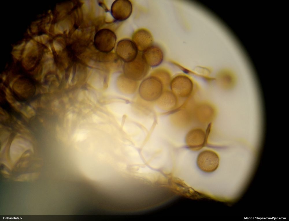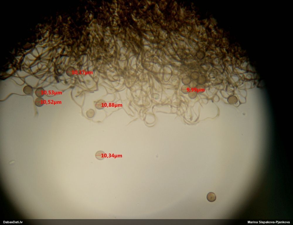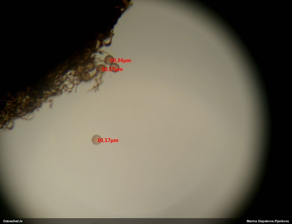 Sporas izskatās ļoti gaišas, varbūt nenobriedušas. Es laikam pēc kāda laiciņa mēģinātu vēlreiz mikroskopēt. Tajā pašā laikā sporu izmēri priekš T.contorta ir pamazi (ja tipiski ir 11-14 mkm, te ir knapi 11 mkm)