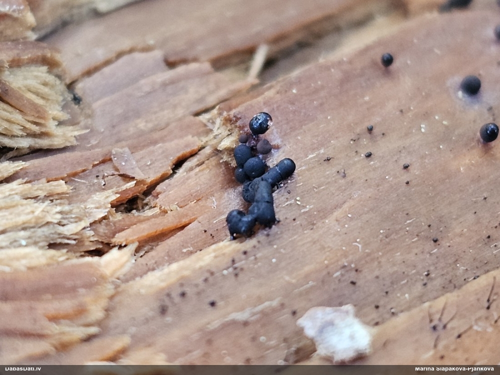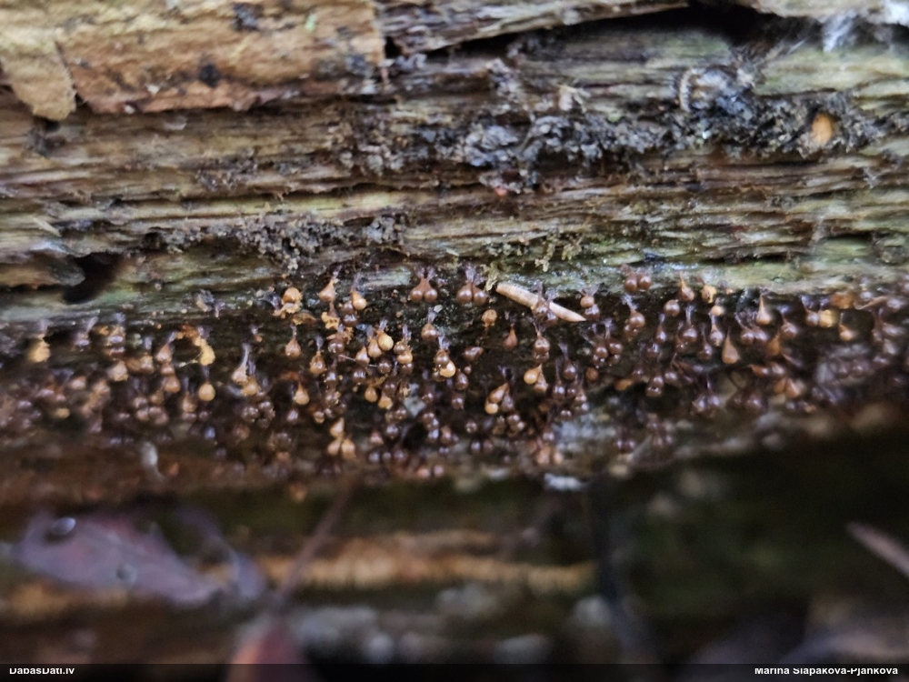 Vai tik nebūs medainā bumbulīte? Augļķermeņi vertikāli izstiepti, sporu mākonis ciešā klājienā.