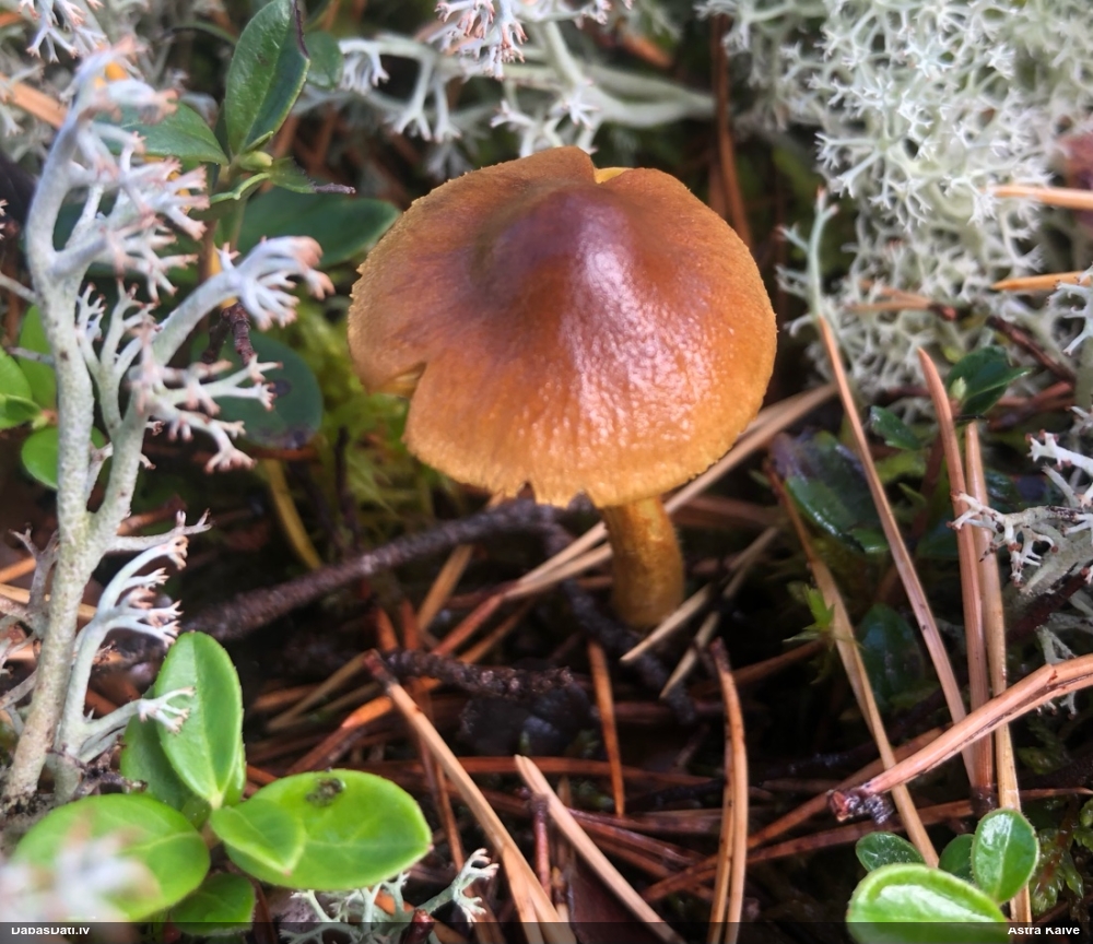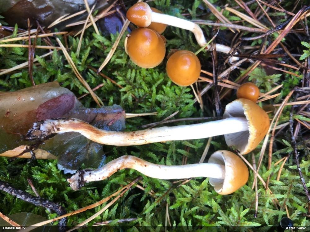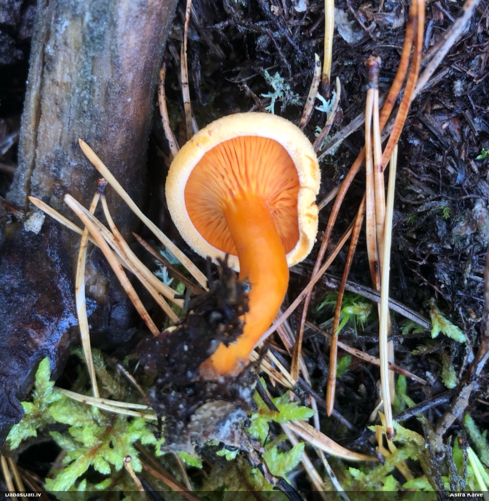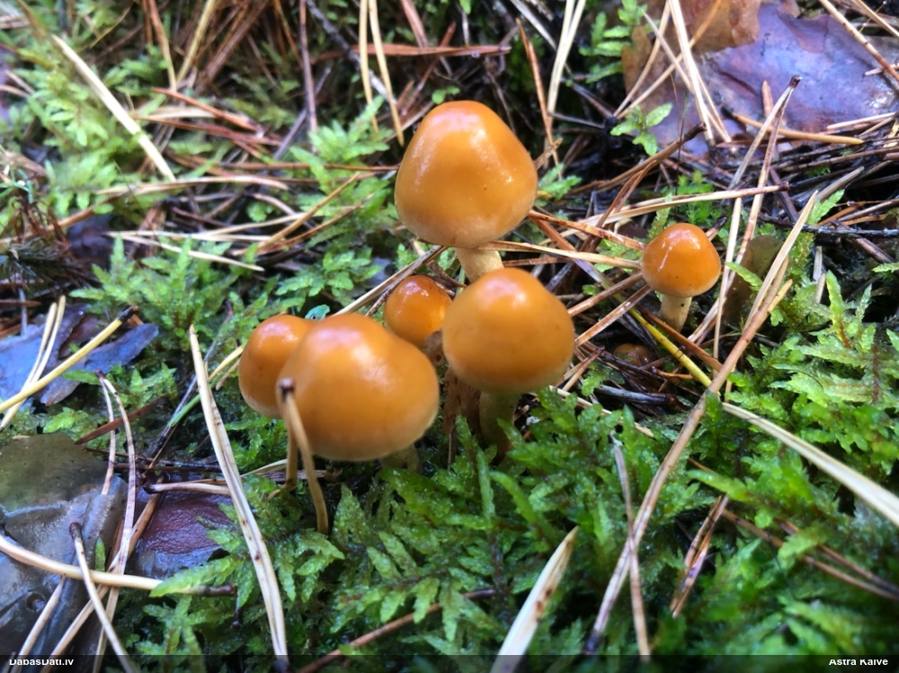 Man pēkšņi radās ideja - vai tur bija nu ļoti mitrs mikroklimats, egle ar melnalksni? Hipotētiski tādas dzeltenas var būt Diachea muscorum. Te bilde ir mazliet līdzīga: https://fr.wikipedia.org/wiki/Fichier:Craterium_muscorum,_Trawscoed,_North_Wales,_Aug_2016_-_Flickr_-_janetgraham84.jpg