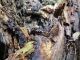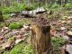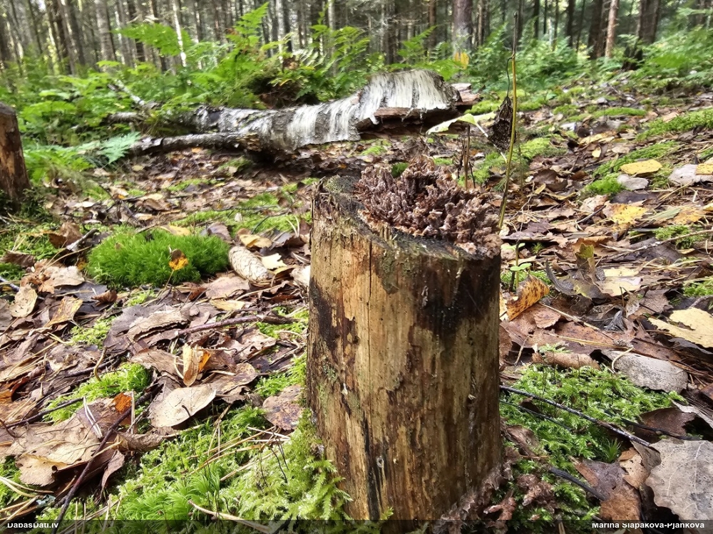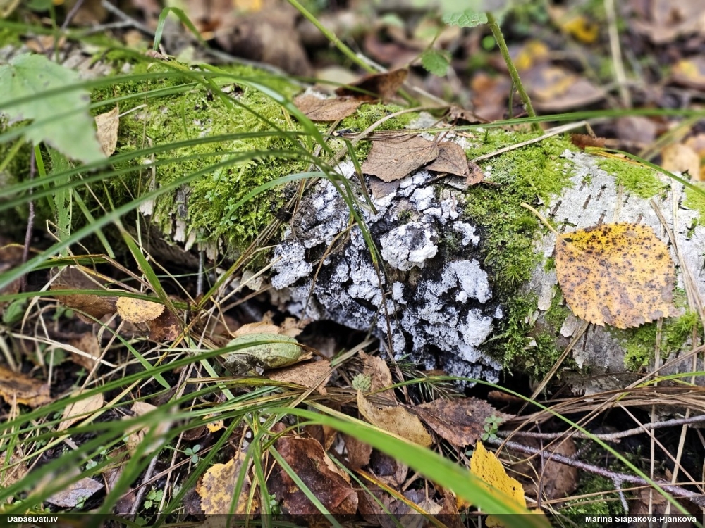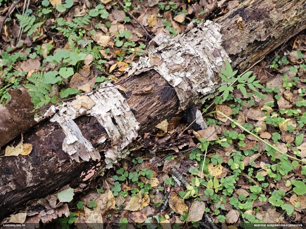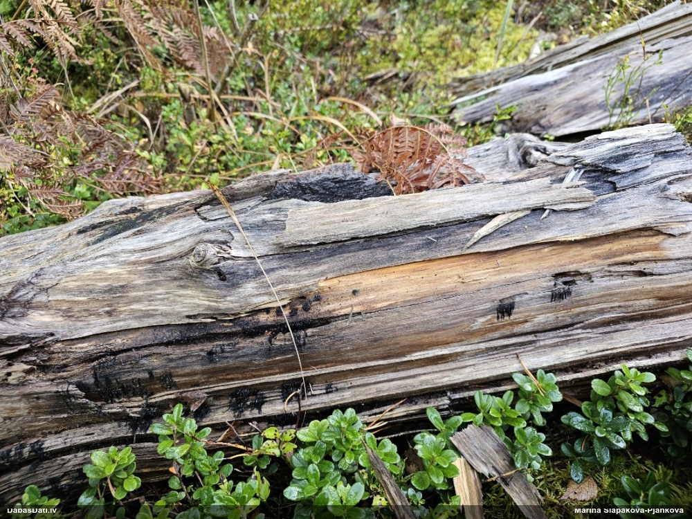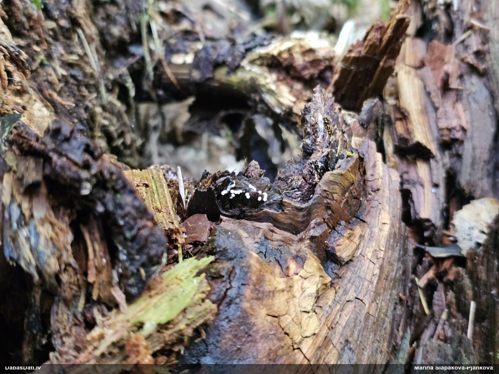Satrūdējusi kritala mežā, nav dēļi. Iespējams, egle, jauktu koku mežs.