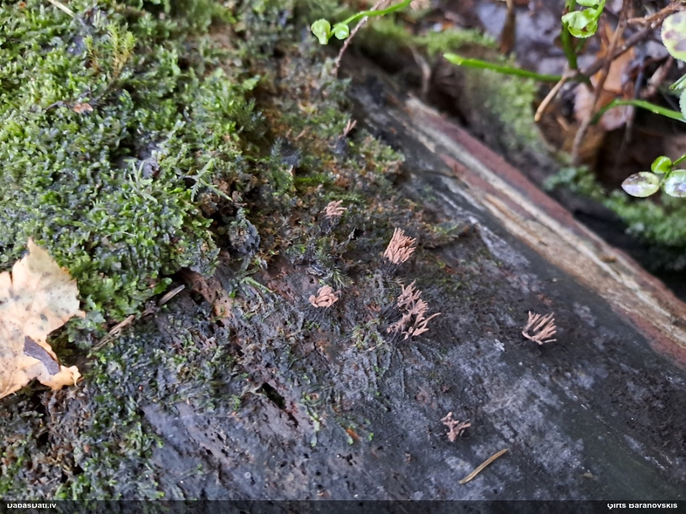 Lai arī Edvīns šo ir skatījis, nesen viņš ir teicis, ka ragansviestus īpaši nav pētījis, turklāt tieši par F.intermedia man stāv atmiņā, ka viņš to vai nu neatzīst, vai īsti nav redzējis, tāpēc pieļauju, ka viņš to varētu arī labi nezināt. Tā kā pati atradu tādu, kas, manuprāt, pēc visām pazīmēm atbilst F.intermedia, tad salīdzināju ar šo, un man izskatās abi ļoti līdzīgi gan pēc iekšējām struktūrām (kā cieši daudzi augļķermeņi kopā sablīvēti), gan pēc sporām (ar izteiktām mazākām un lielāku, treknāku kārpu grupām). Un lai vai kā, šai ir lielākas sporas nekā F.septica tipiski ir (6-9 mkm un 9-11 mkm tomēr nav gluži tas pats, pat ja "9" pārklājas). Un vācu noteicējā tulkojumā par F.intermedia atradumu teikts "Nobriedušas ētālijas bija veidojušās ar vai bez garozas, un pēdējā gadījumā bieži bija rozā krāsā." - un te ir tas rozā gadījums. Turklāt F.intermedia nereti aug uz dzīviem augiem (un sūnas tādas ir). Tā ka es tomēr palieku pie F.intermedia viedokļa.