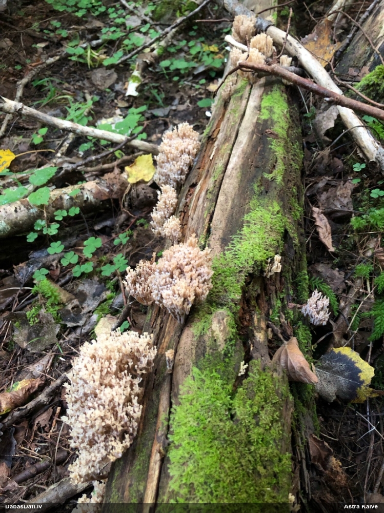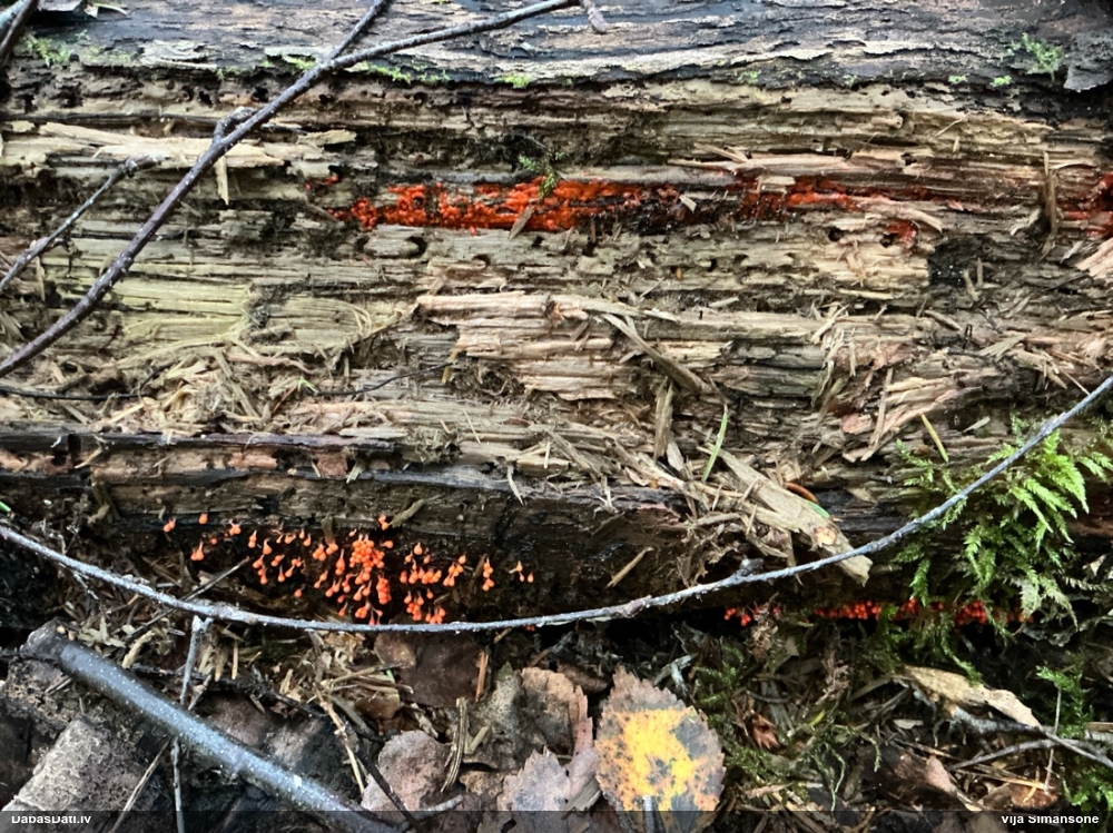 Satrūdējusi kritala mežā, nav dēļi. Iespējams, egle, jauktu koku mežs.