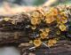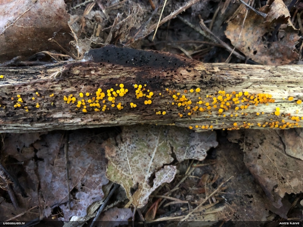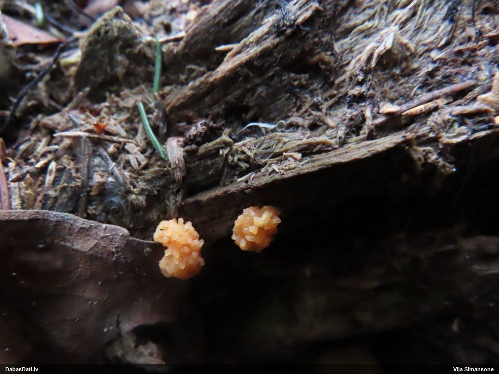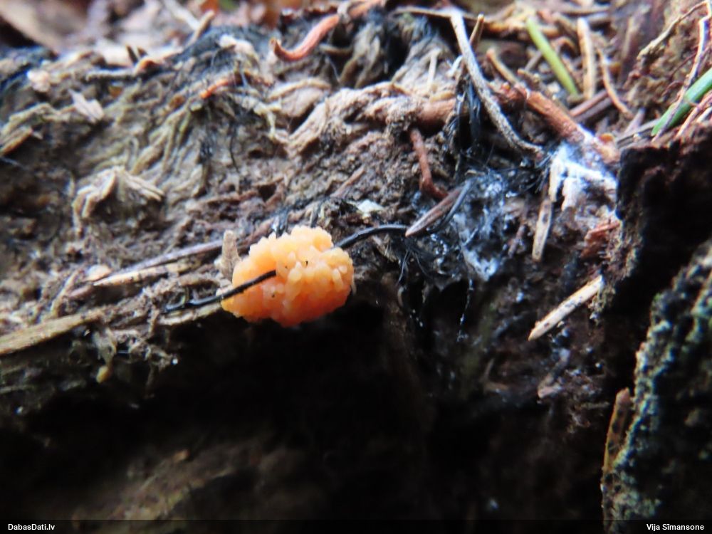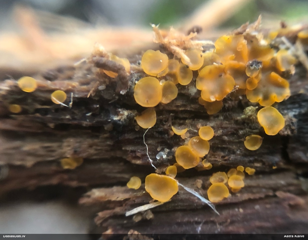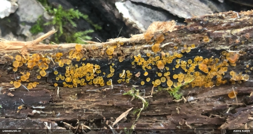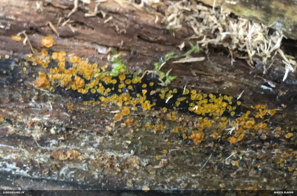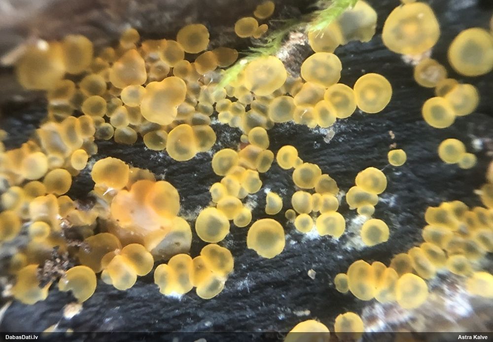 Man pēkšņi radās ideja - vai tur bija nu ļoti mitrs mikroklimats, egle ar melnalksni? Hipotētiski tādas dzeltenas var būt Diachea muscorum. Te bilde ir mazliet līdzīga: https://fr.wikipedia.org/wiki/Fichier:Craterium_muscorum,_Trawscoed,_North_Wales,_Aug_2016_-_Flickr_-_janetgraham84.jpg