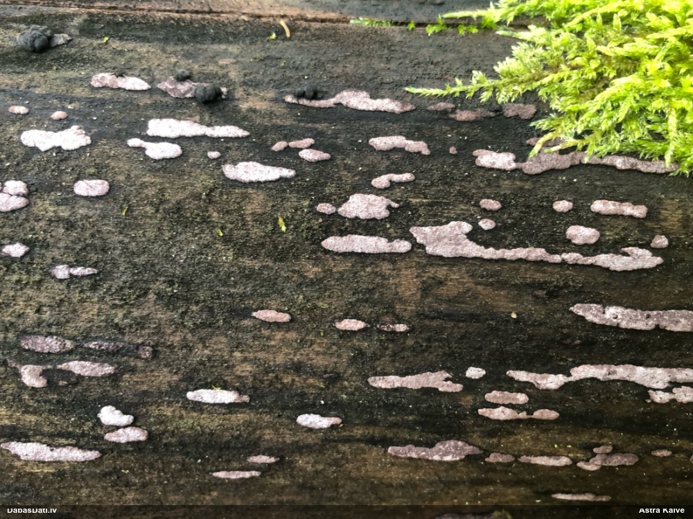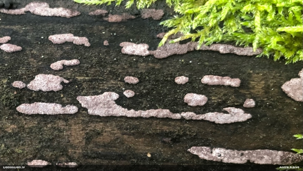 Lai arī Edvīns šo ir skatījis, nesen viņš ir teicis, ka ragansviestus īpaši nav pētījis, turklāt tieši par F.intermedia man stāv atmiņā, ka viņš to vai nu neatzīst, vai īsti nav redzējis, tāpēc pieļauju, ka viņš to varētu arī labi nezināt. Tā kā pati atradu tādu, kas, manuprāt, pēc visām pazīmēm atbilst F.intermedia, tad salīdzināju ar šo, un man izskatās abi ļoti līdzīgi gan pēc iekšējām struktūrām (kā cieši daudzi augļķermeņi kopā sablīvēti), gan pēc sporām (ar izteiktām mazākām un lielāku, treknāku kārpu grupām). Un lai vai kā, šai ir lielākas sporas nekā F.septica tipiski ir (6-9 mkm un 9-11 mkm tomēr nav gluži tas pats, pat ja "9" pārklājas). Un vācu noteicējā tulkojumā par F.intermedia atradumu teikts "Nobriedušas ētālijas bija veidojušās ar vai bez garozas, un pēdējā gadījumā bieži bija rozā krāsā." - un te ir tas rozā gadījums. Turklāt F.intermedia nereti aug uz dzīviem augiem (un sūnas tādas ir). Tā ka es tomēr palieku pie F.intermedia viedokļa.