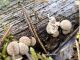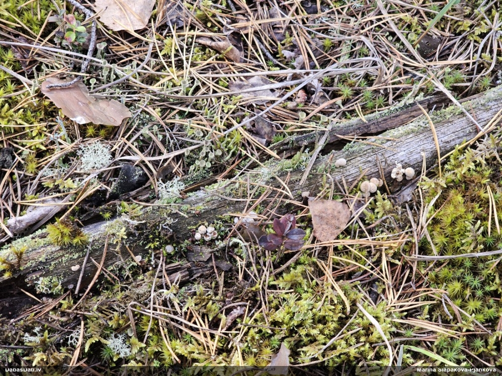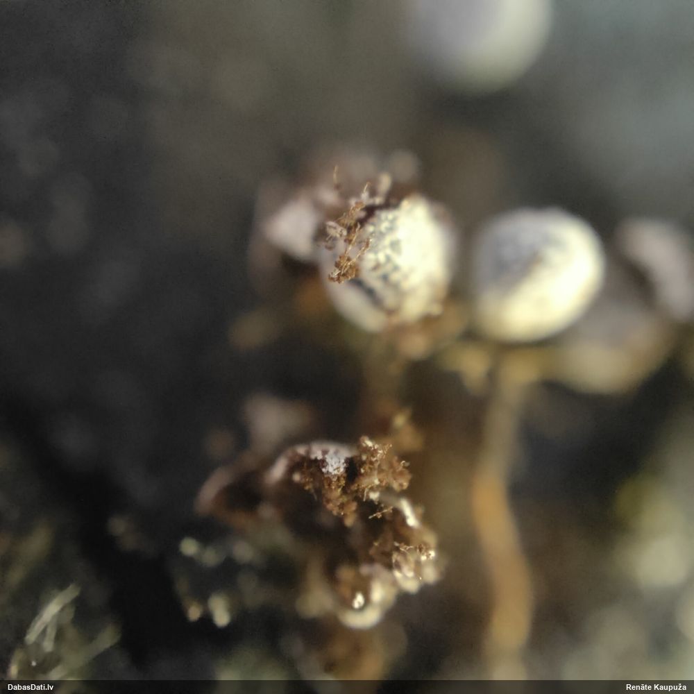 Man pēkšņi radās ideja - vai tur bija nu ļoti mitrs mikroklimats, egle ar melnalksni? Hipotētiski tādas dzeltenas var būt Diachea muscorum. Te bilde ir mazliet līdzīga: https://fr.wikipedia.org/wiki/Fichier:Craterium_muscorum,_Trawscoed,_North_Wales,_Aug_2016_-_Flickr_-_janetgraham84.jpg