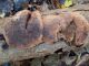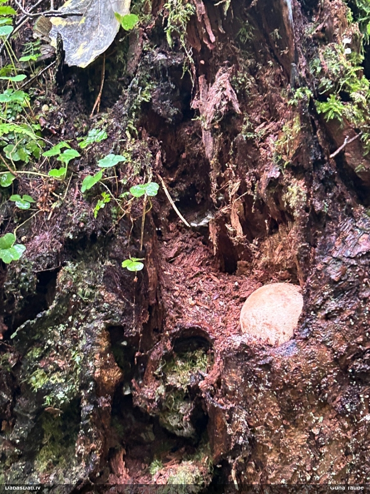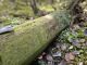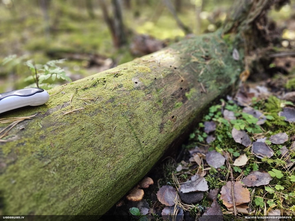Satrūdējusi kritala mežā, nav dēļi. Iespējams, egle, jauktu koku mežs.