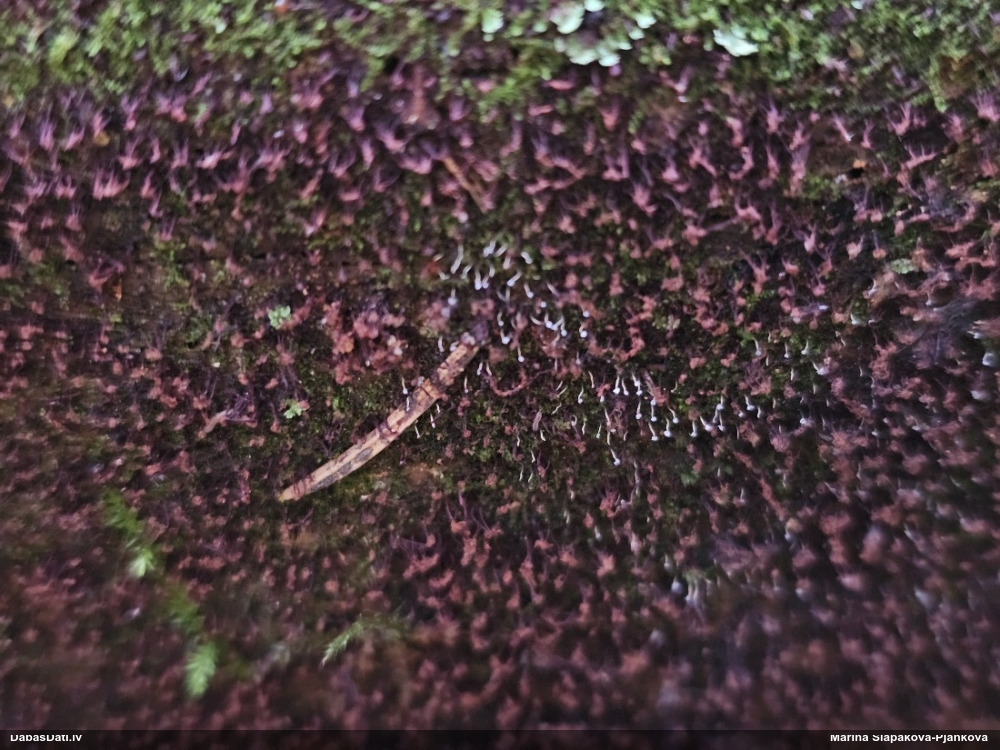 Lai arī Edvīns šo ir skatījis, nesen viņš ir teicis, ka ragansviestus īpaši nav pētījis, turklāt tieši par F.intermedia man stāv atmiņā, ka viņš to vai nu neatzīst, vai īsti nav redzējis, tāpēc pieļauju, ka viņš to varētu arī labi nezināt. Tā kā pati atradu tādu, kas, manuprāt, pēc visām pazīmēm atbilst F.intermedia, tad salīdzināju ar šo, un man izskatās abi ļoti līdzīgi gan pēc iekšējām struktūrām (kā cieši daudzi augļķermeņi kopā sablīvēti), gan pēc sporām (ar izteiktām mazākām un lielāku, treknāku kārpu grupām). Un lai vai kā, šai ir lielākas sporas nekā F.septica tipiski ir (6-9 mkm un 9-11 mkm tomēr nav gluži tas pats, pat ja "9" pārklājas). Un vācu noteicējā tulkojumā par F.intermedia atradumu teikts "Nobriedušas ētālijas bija veidojušās ar vai bez garozas, un pēdējā gadījumā bieži bija rozā krāsā." - un te ir tas rozā gadījums. Turklāt F.intermedia nereti aug uz dzīviem augiem (un sūnas tādas ir). Tā ka es tomēr palieku pie F.intermedia viedokļa.
