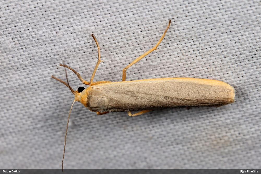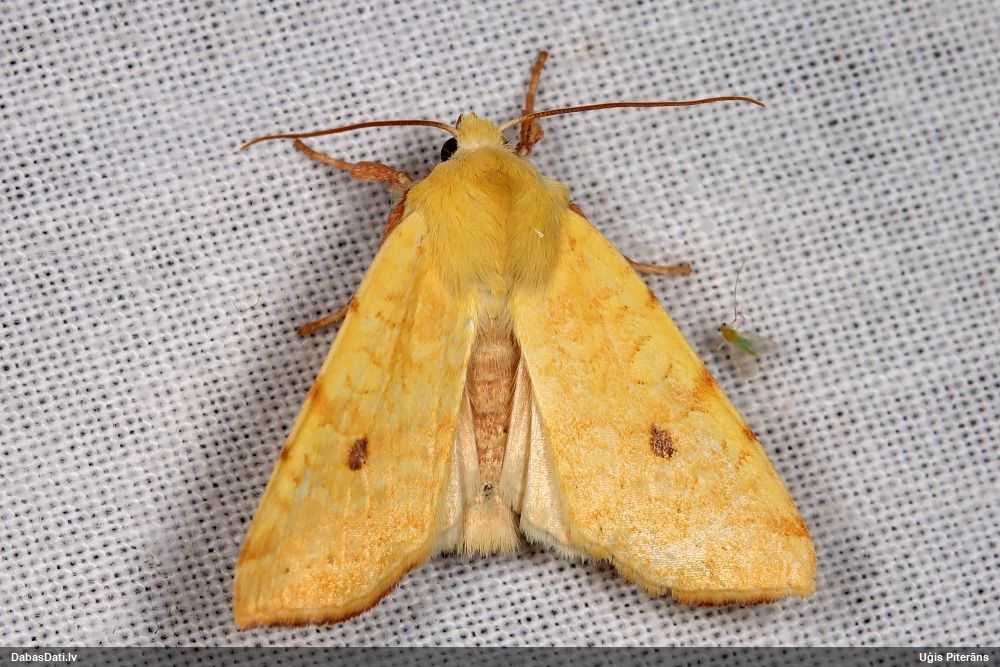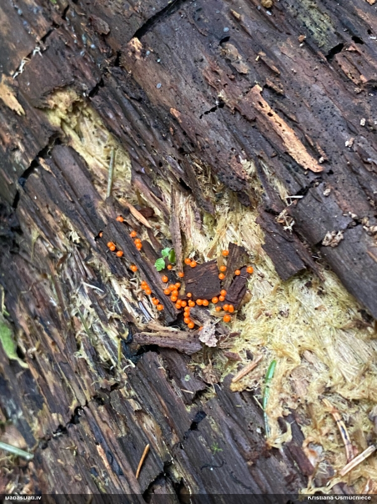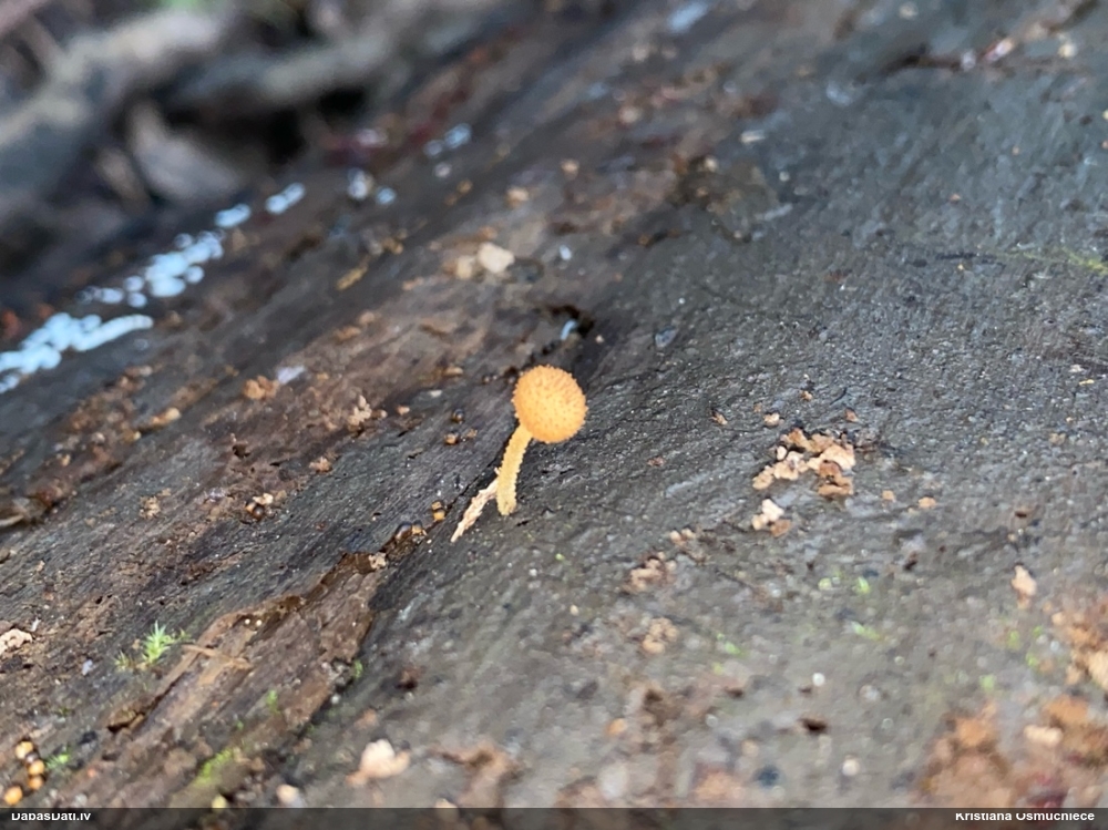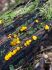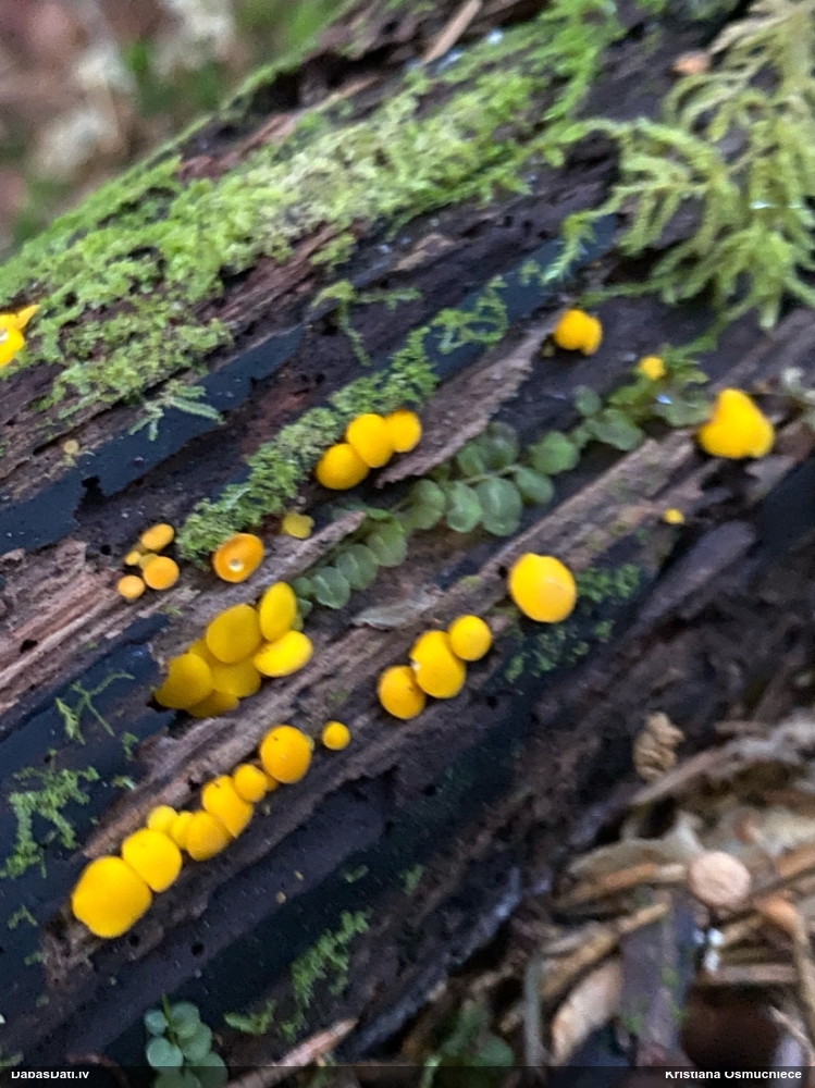Man pēkšņi radās ideja - vai tur bija nu ļoti mitrs mikroklimats, egle ar melnalksni? Hipotētiski tādas dzeltenas var būt Diachea muscorum. Te bilde ir mazliet līdzīga: https://fr.wikipedia.org/wiki/Fichier:Craterium_muscorum,_Trawscoed,_North_Wales,_Aug_2016_-_Flickr_-_janetgraham84.jpg