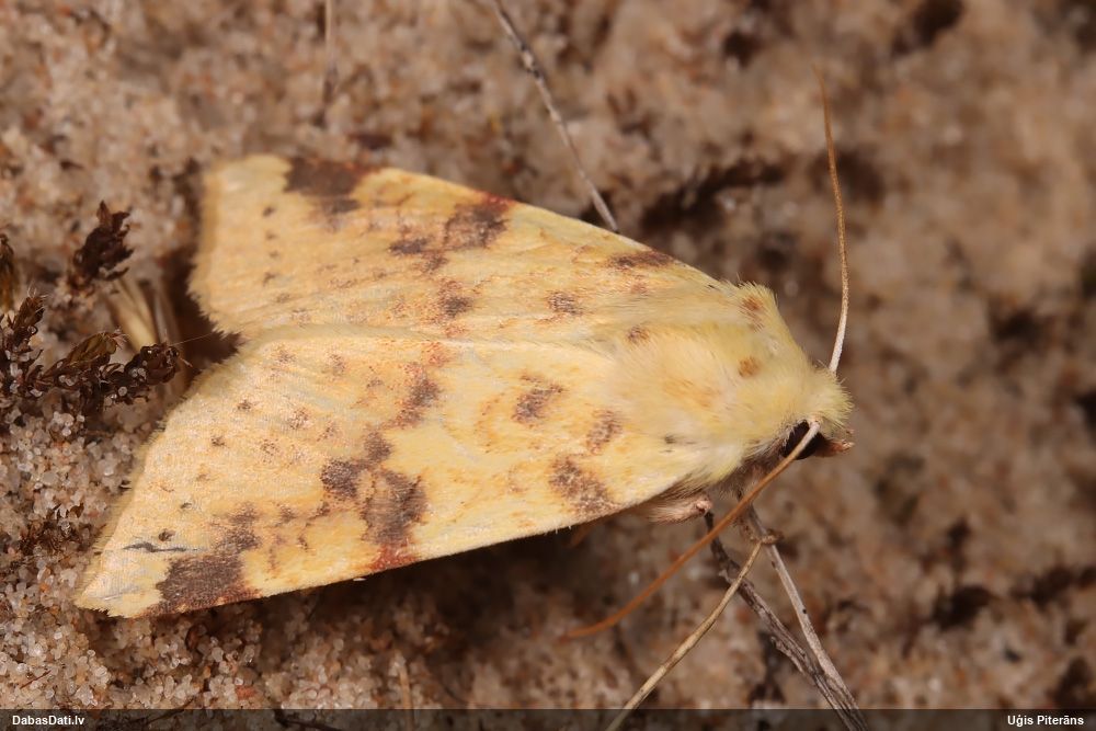 Man pēkšņi radās ideja - vai tur bija nu ļoti mitrs mikroklimats, egle ar melnalksni? Hipotētiski tādas dzeltenas var būt Diachea muscorum. Te bilde ir mazliet līdzīga: https://fr.wikipedia.org/wiki/Fichier:Craterium_muscorum,_Trawscoed,_North_Wales,_Aug_2016_-_Flickr_-_janetgraham84.jpg