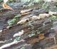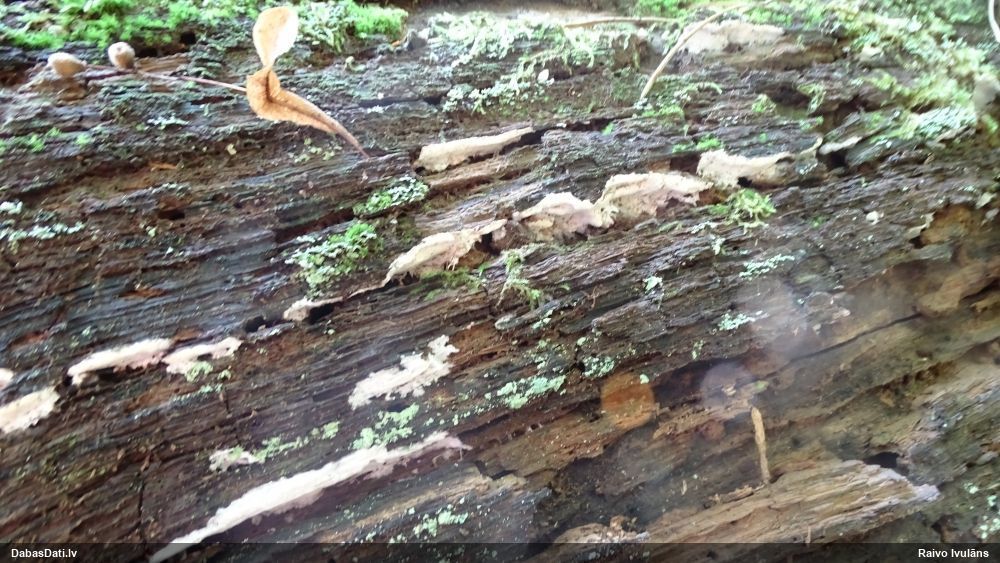 Satrūdējusi kritala mežā, nav dēļi. Iespējams, egle, jauktu koku mežs.