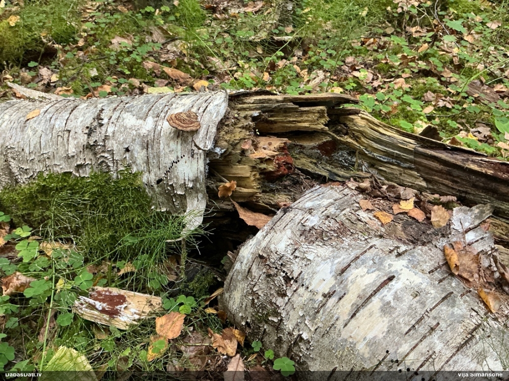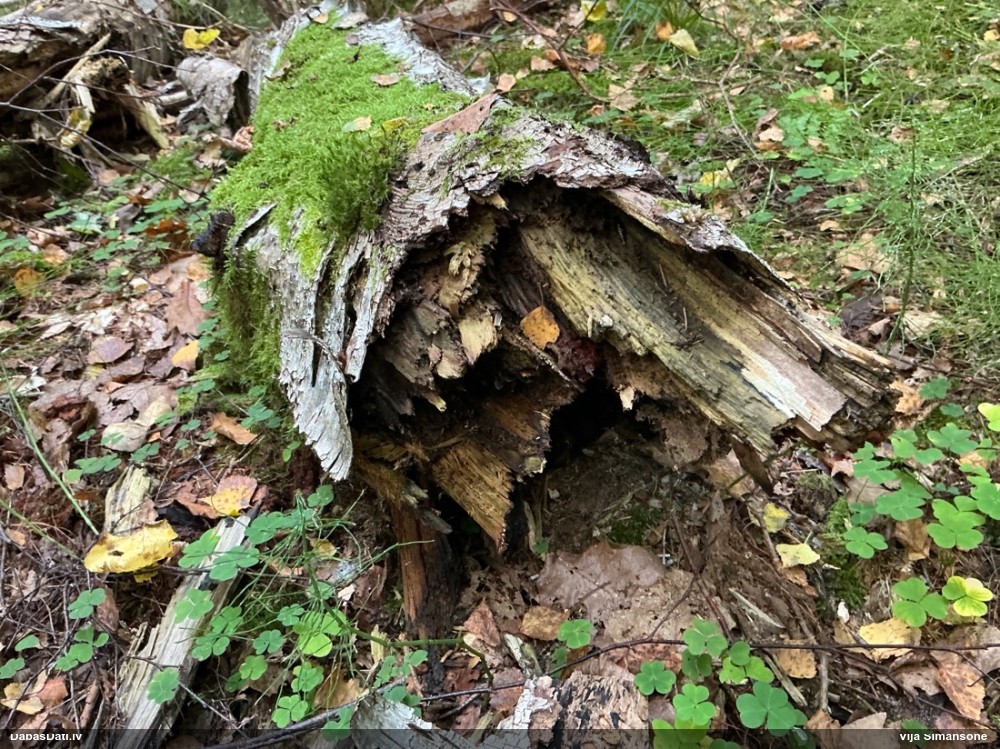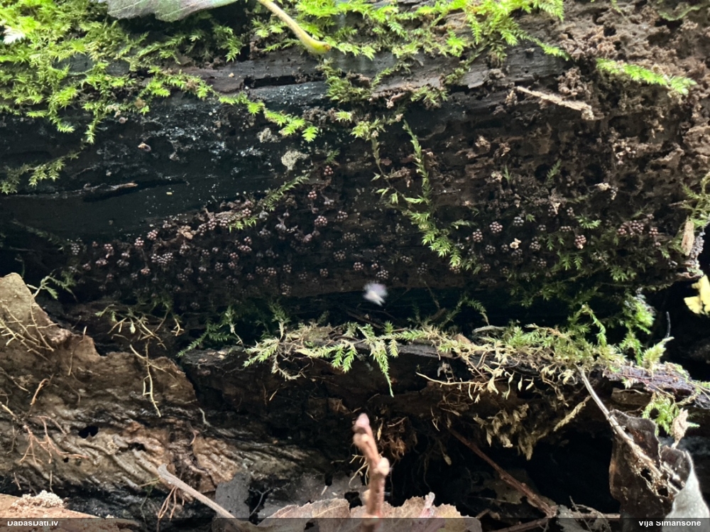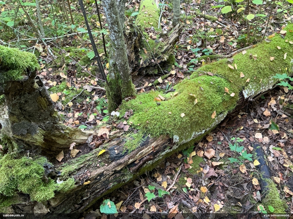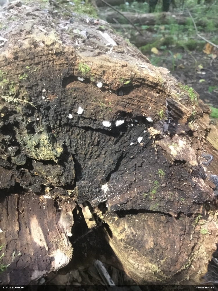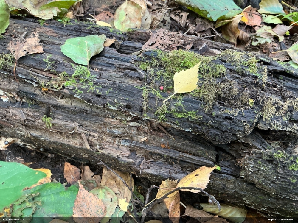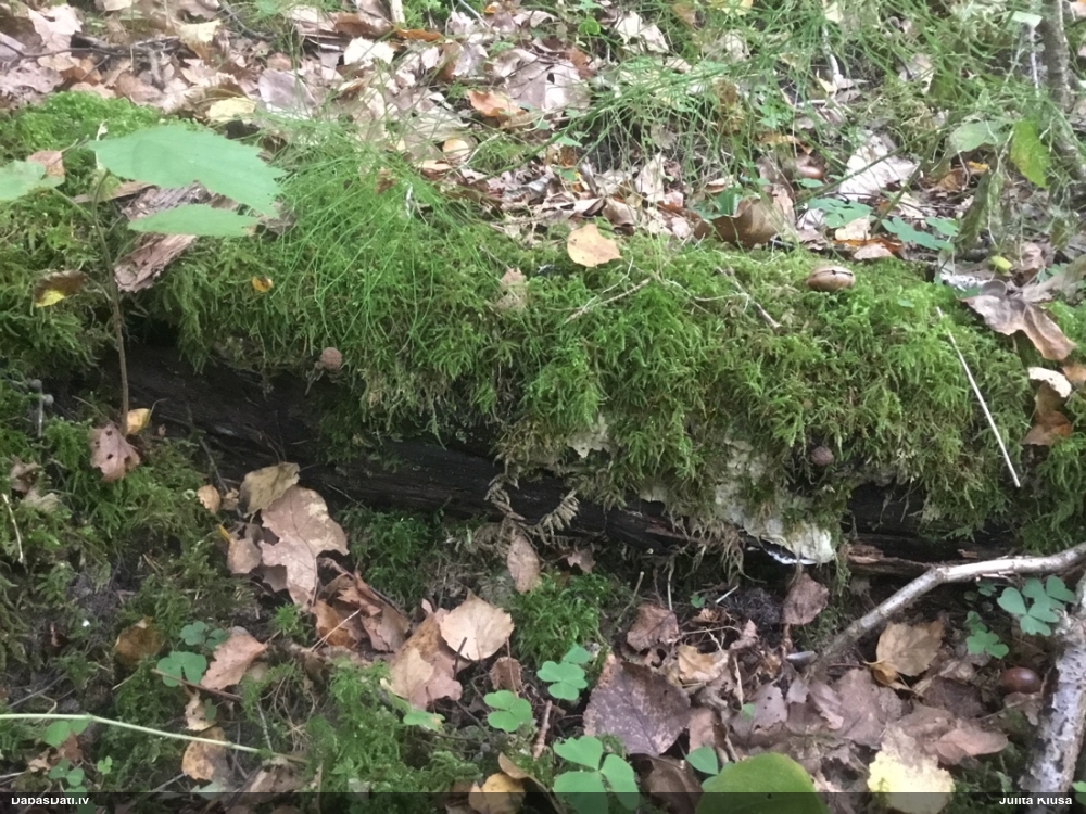 Satrūdējusi kritala mežā, nav dēļi. Iespējams, egle, jauktu koku mežs.
