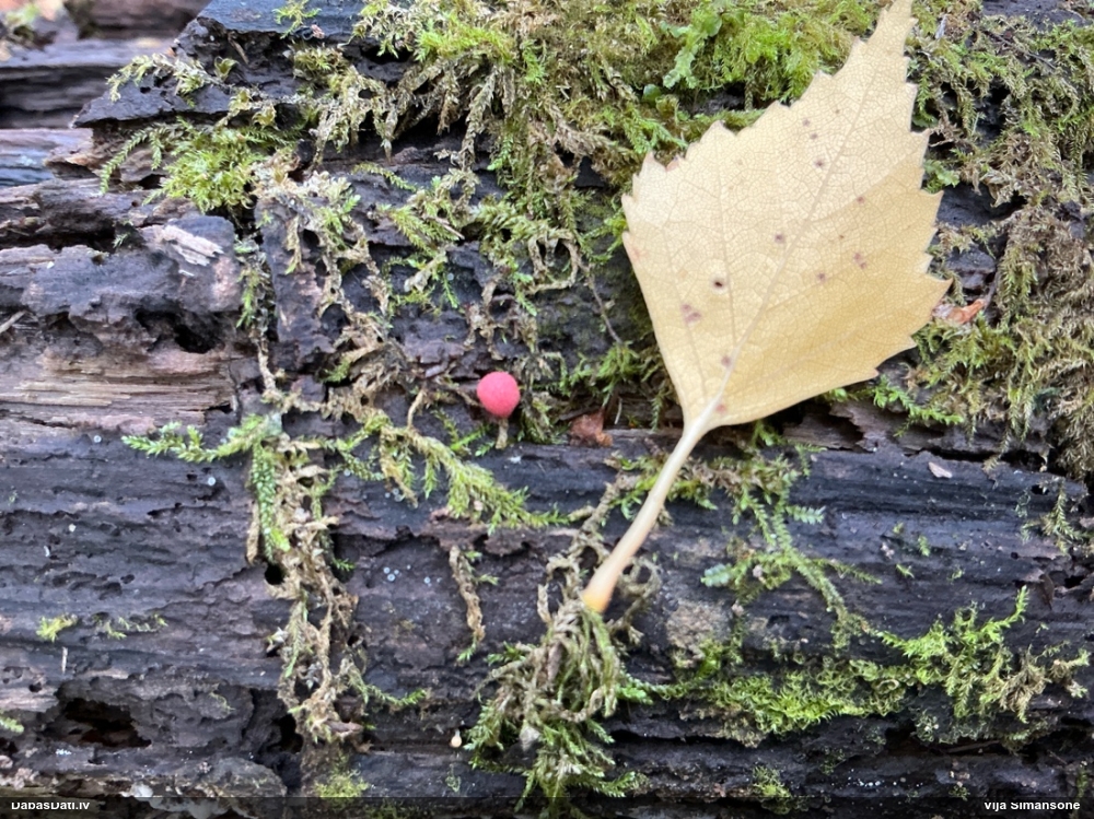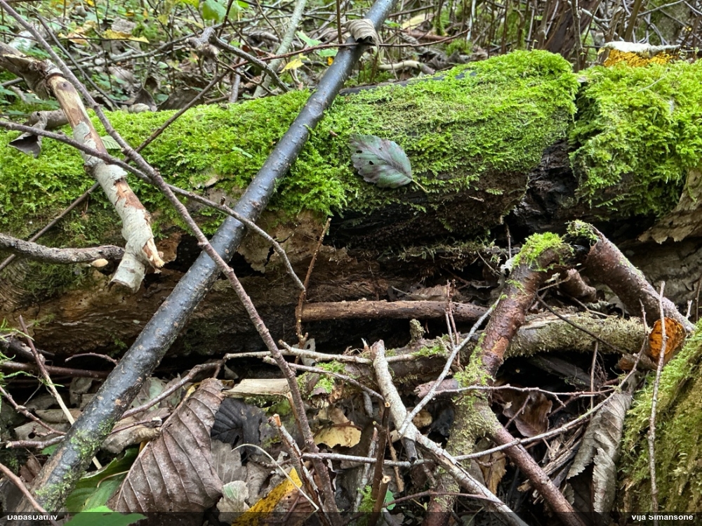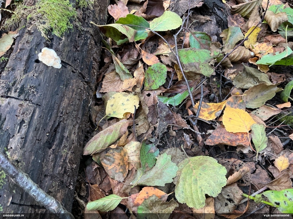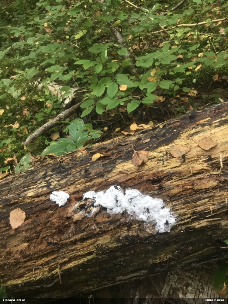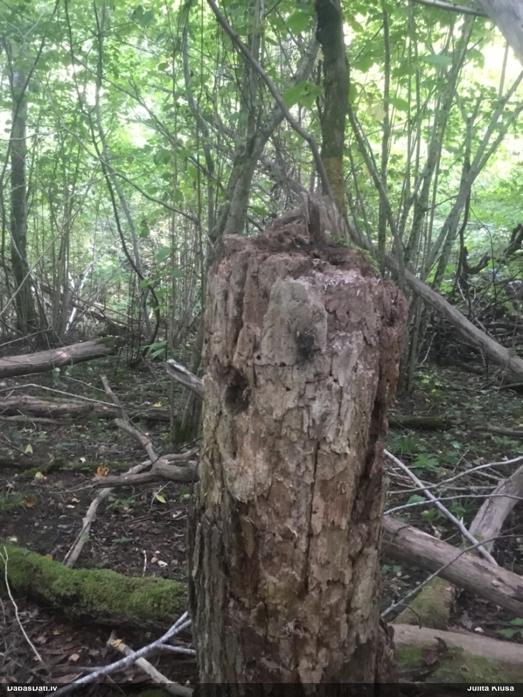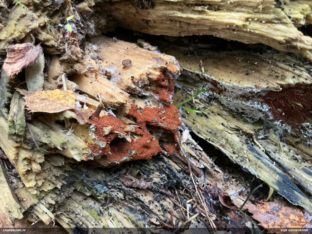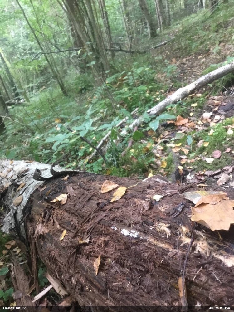 Satrūdējusi kritala mežā, nav dēļi. Iespējams, egle, jauktu koku mežs.