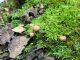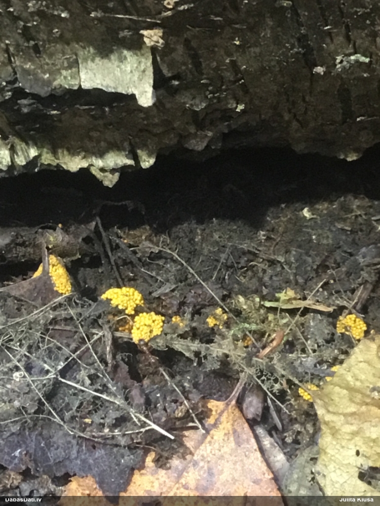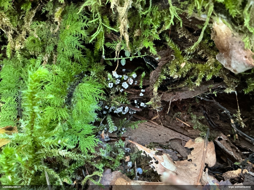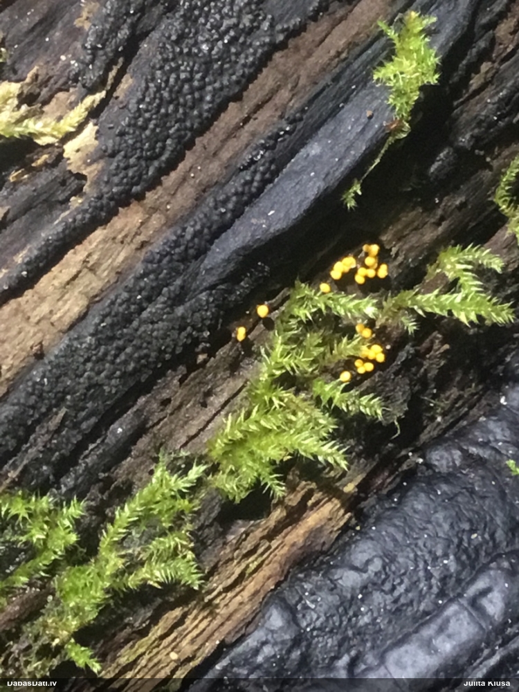 Man pēkšņi radās ideja - vai tur bija nu ļoti mitrs mikroklimats, egle ar melnalksni? Hipotētiski tādas dzeltenas var būt Diachea muscorum. Te bilde ir mazliet līdzīga: https://fr.wikipedia.org/wiki/Fichier:Craterium_muscorum,_Trawscoed,_North_Wales,_Aug_2016_-_Flickr_-_janetgraham84.jpg