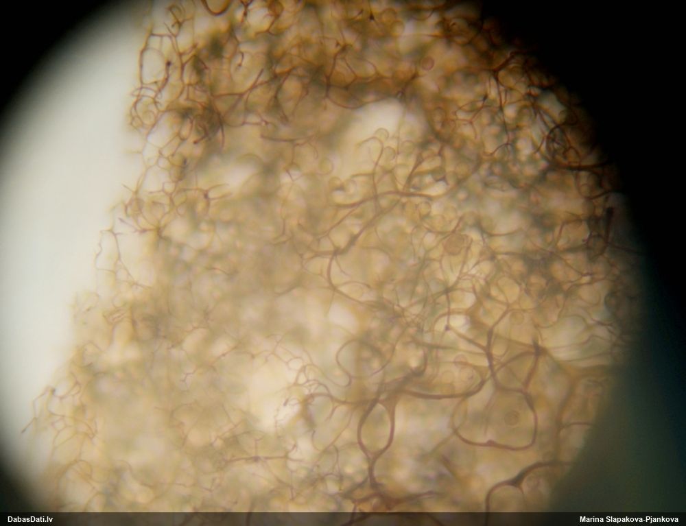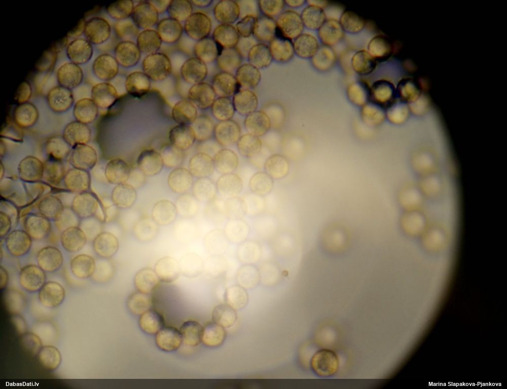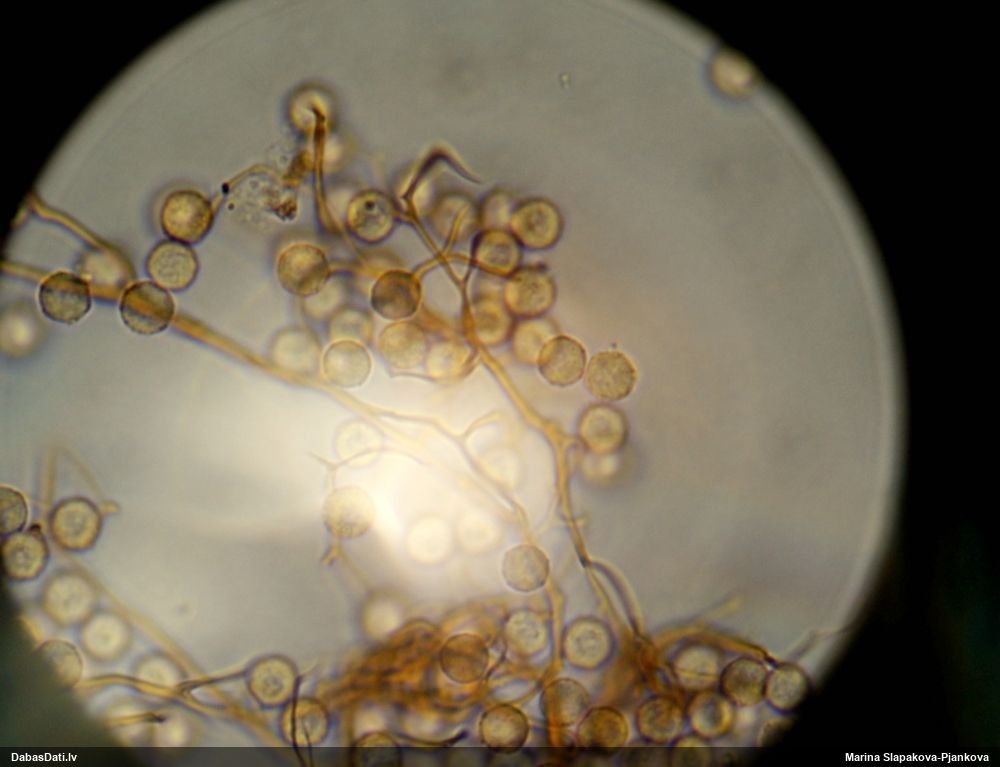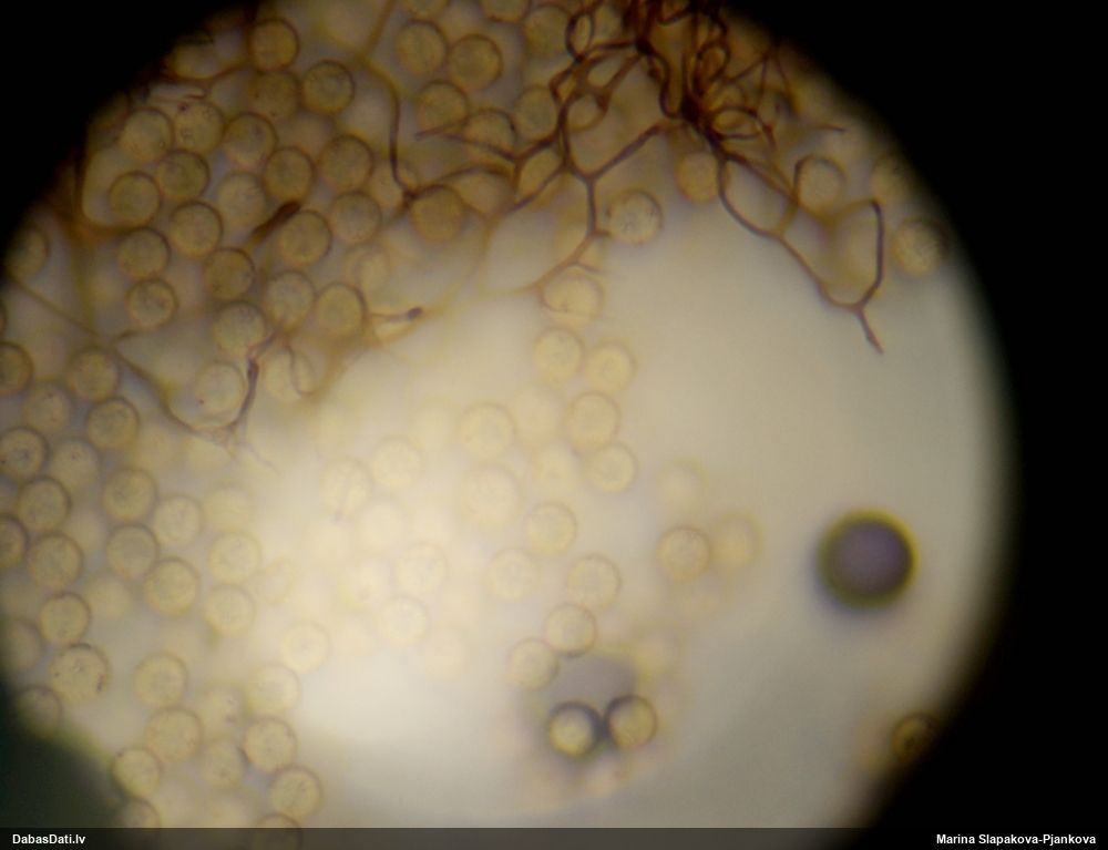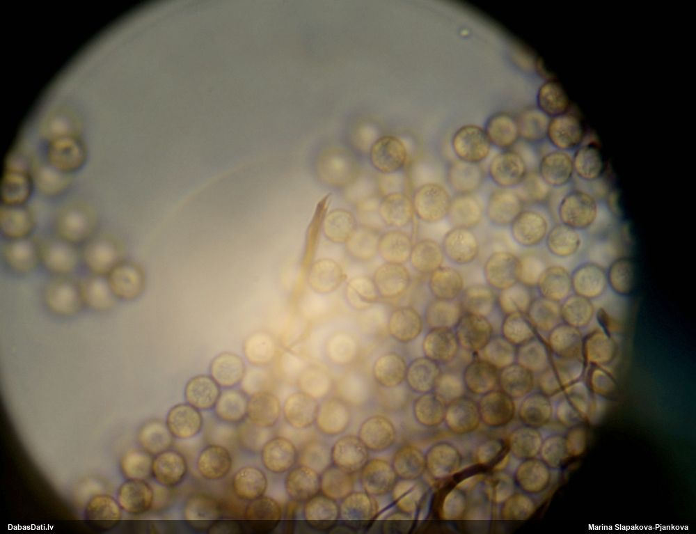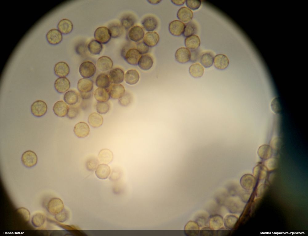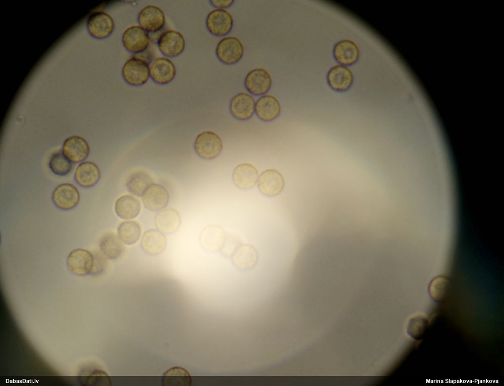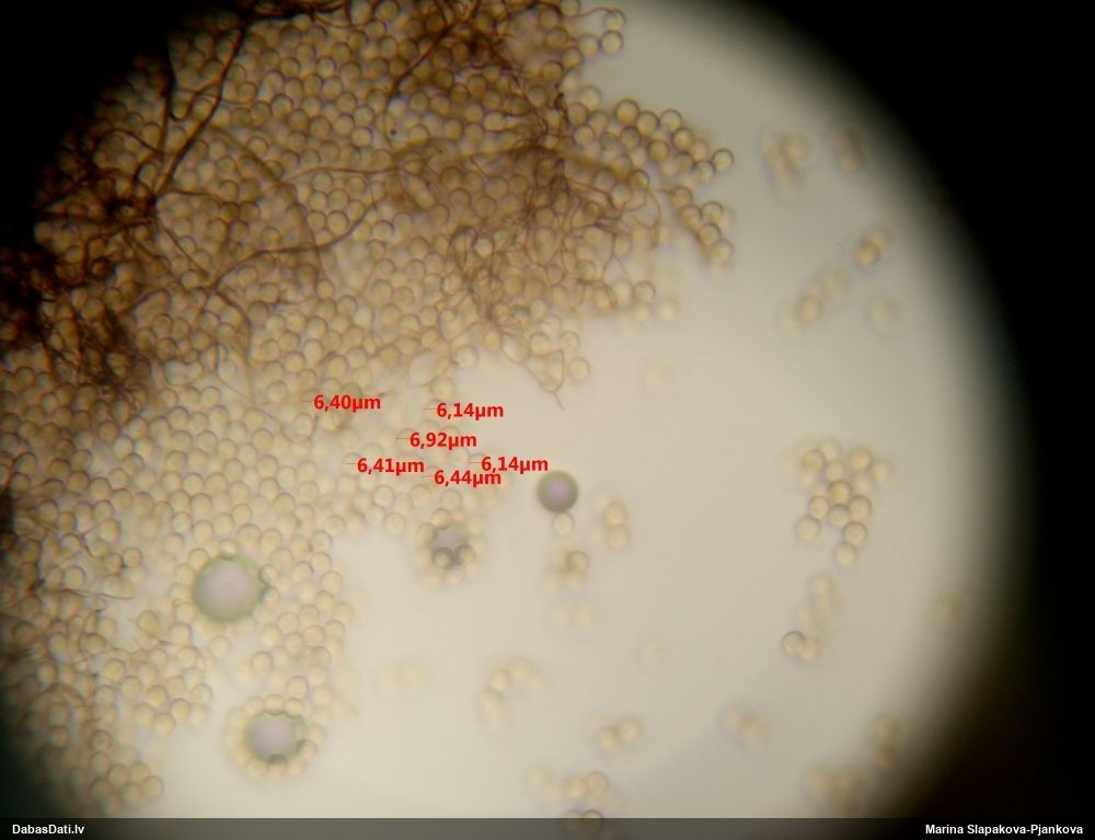 Sporas izskatās ļoti gaišas, varbūt nenobriedušas. Es laikam pēc kāda laiciņa mēģinātu vēlreiz mikroskopēt. Tajā pašā laikā sporu izmēri priekš T.contorta ir pamazi (ja tipiski ir 11-14 mkm, te ir knapi 11 mkm)