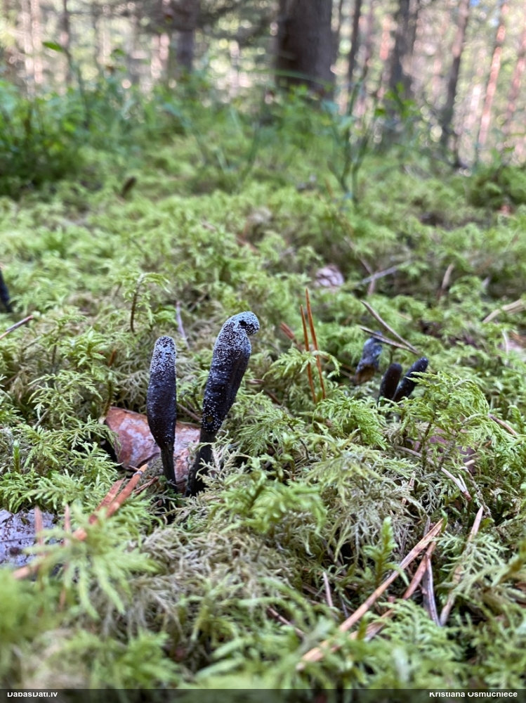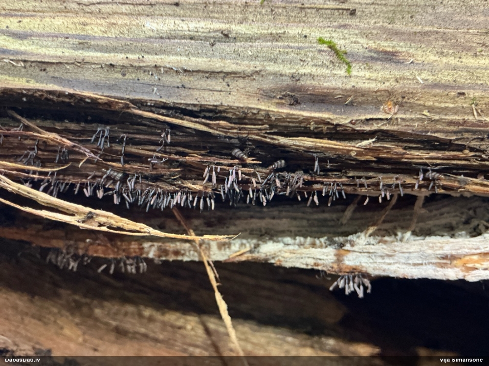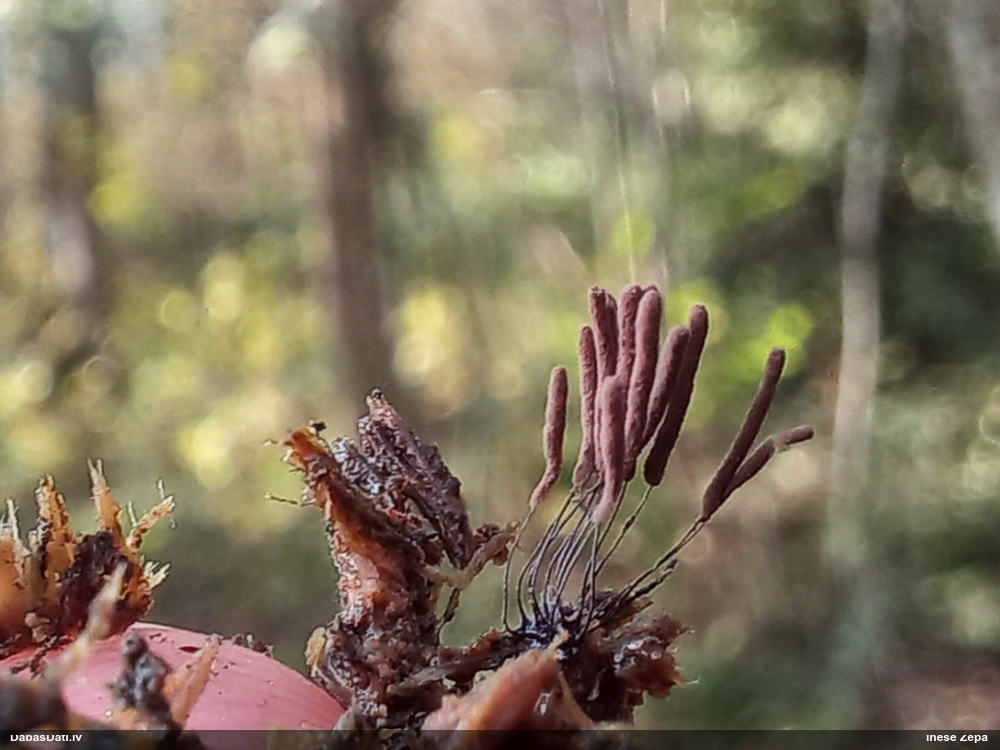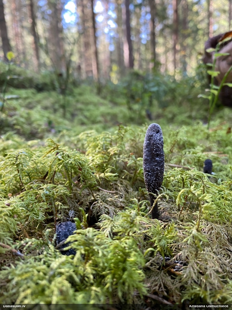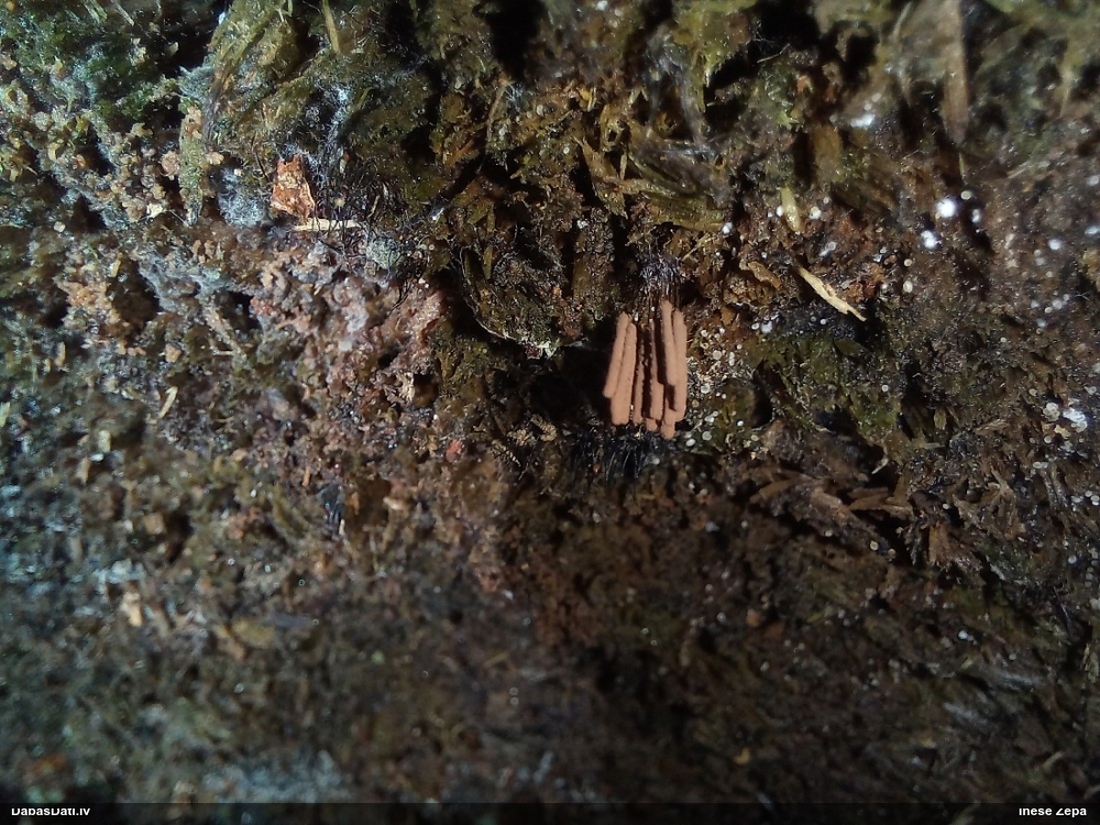 Vai tik nebūs medainā bumbulīte? Augļķermeņi vertikāli izstiepti, sporu mākonis ciešā klājienā.