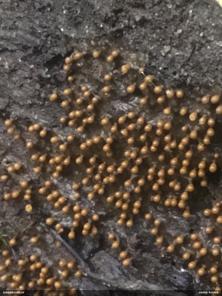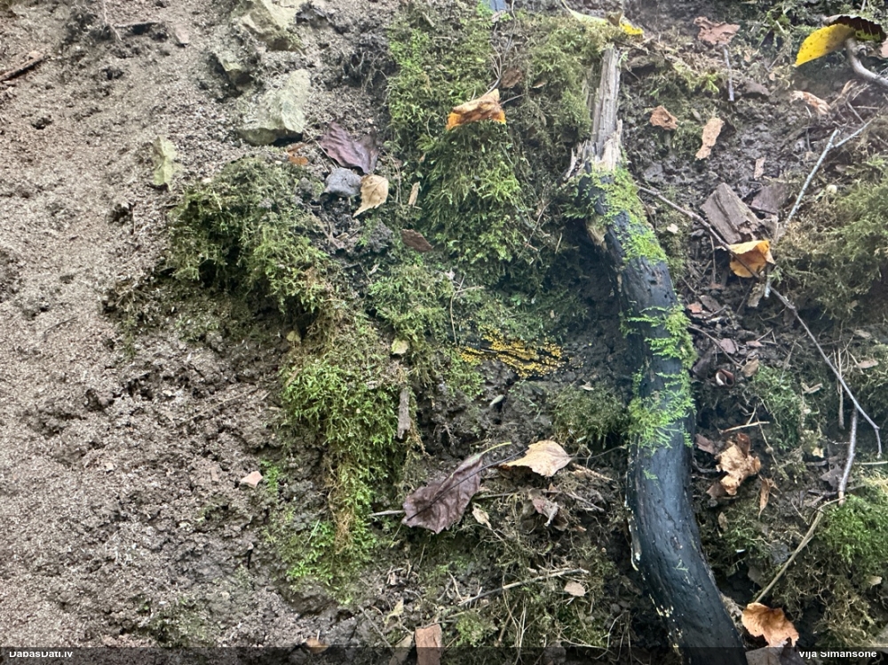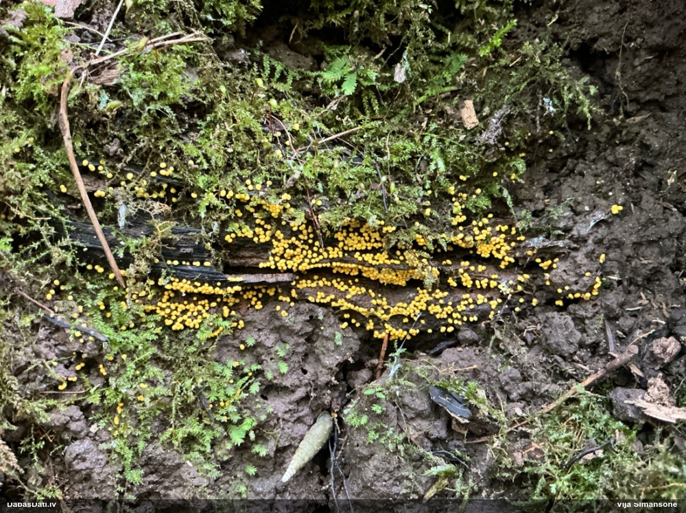 Man pēkšņi radās ideja - vai tur bija nu ļoti mitrs mikroklimats, egle ar melnalksni? Hipotētiski tādas dzeltenas var būt Diachea muscorum. Te bilde ir mazliet līdzīga: https://fr.wikipedia.org/wiki/Fichier:Craterium_muscorum,_Trawscoed,_North_Wales,_Aug_2016_-_Flickr_-_janetgraham84.jpg