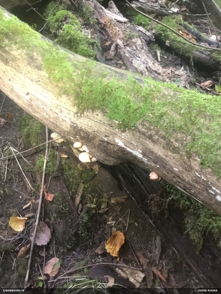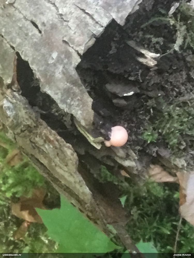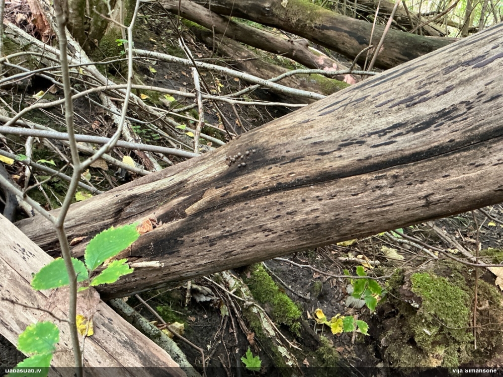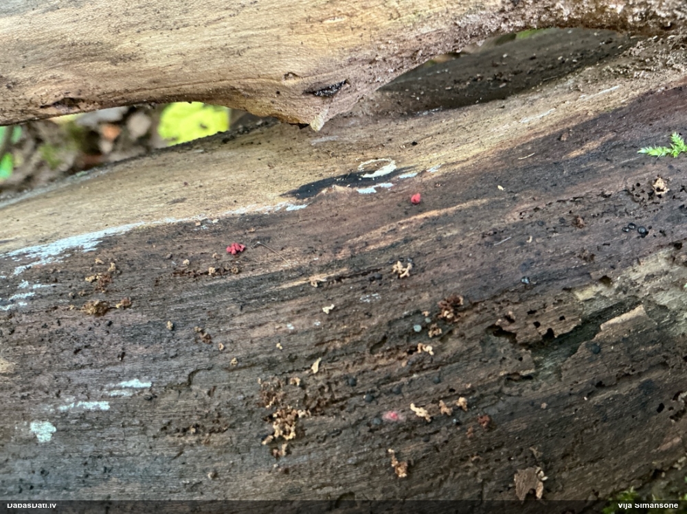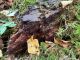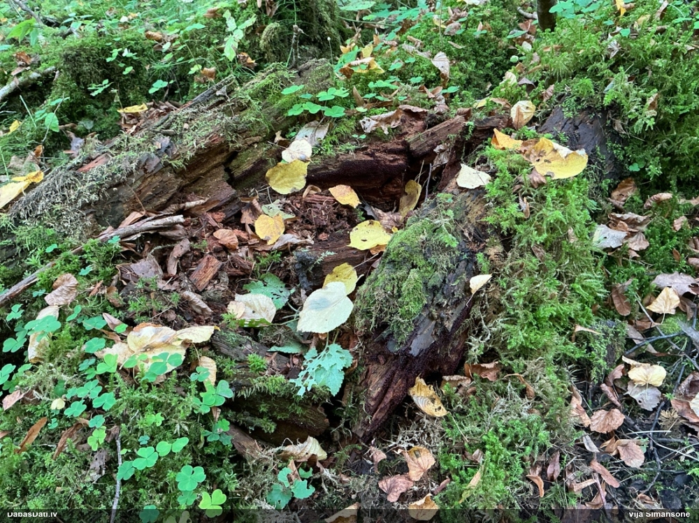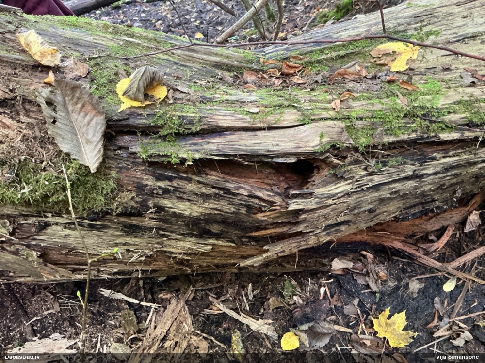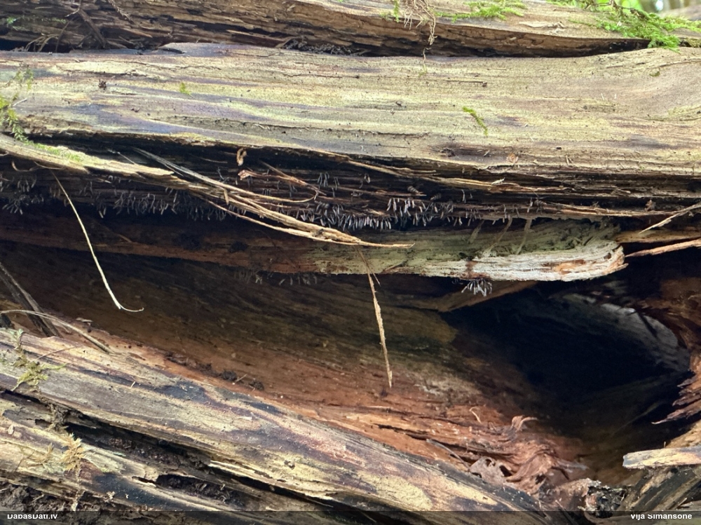 Satrūdējusi kritala mežā, nav dēļi. Iespējams, egle, jauktu koku mežs.