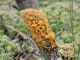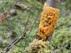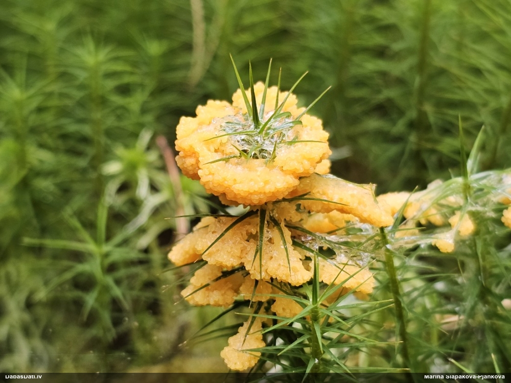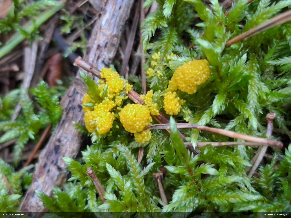 Man pēkšņi radās ideja - vai tur bija nu ļoti mitrs mikroklimats, egle ar melnalksni? Hipotētiski tādas dzeltenas var būt Diachea muscorum. Te bilde ir mazliet līdzīga: https://fr.wikipedia.org/wiki/Fichier:Craterium_muscorum,_Trawscoed,_North_Wales,_Aug_2016_-_Flickr_-_janetgraham84.jpg
