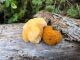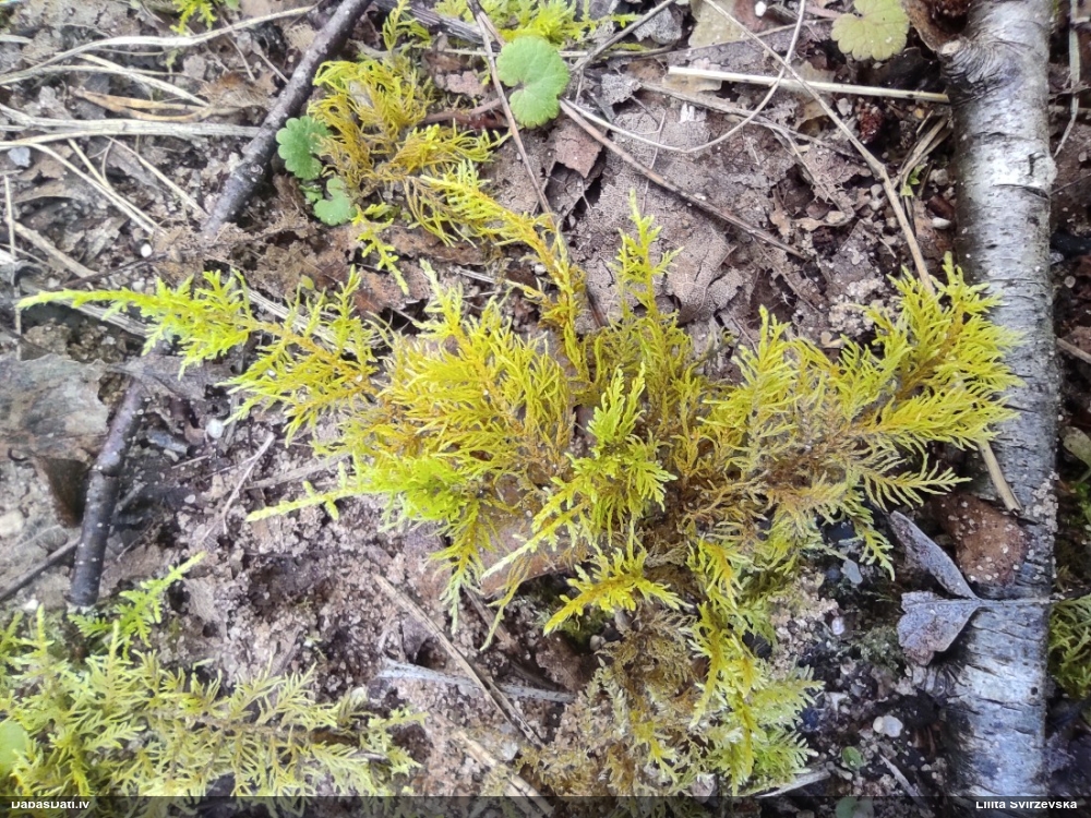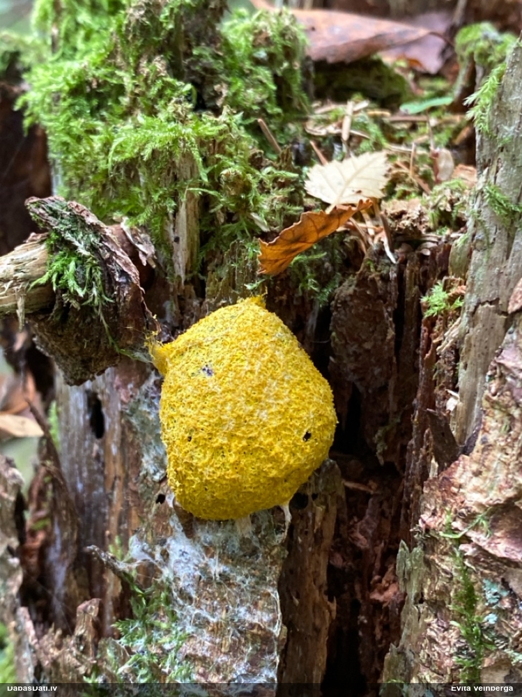 Man pēkšņi radās ideja - vai tur bija nu ļoti mitrs mikroklimats, egle ar melnalksni? Hipotētiski tādas dzeltenas var būt Diachea muscorum. Te bilde ir mazliet līdzīga: https://fr.wikipedia.org/wiki/Fichier:Craterium_muscorum,_Trawscoed,_North_Wales,_Aug_2016_-_Flickr_-_janetgraham84.jpg