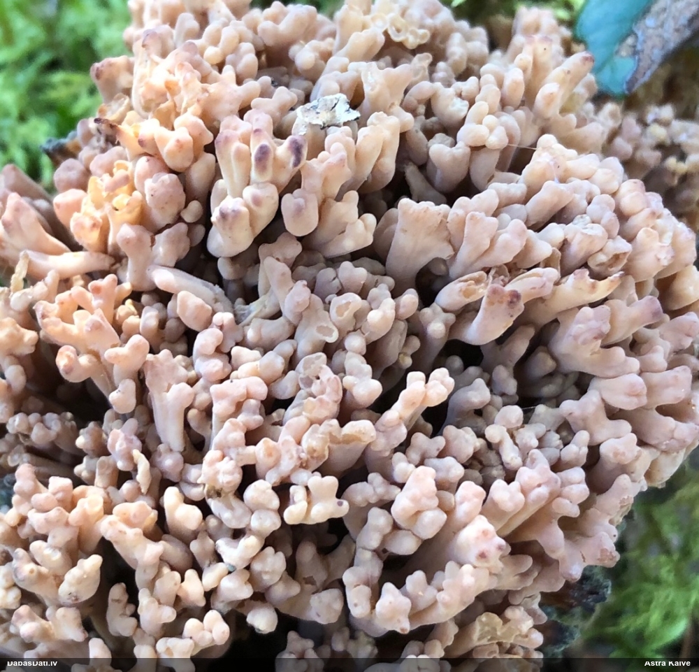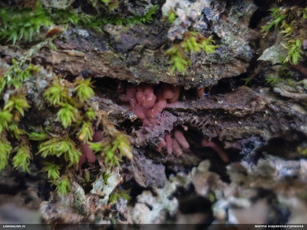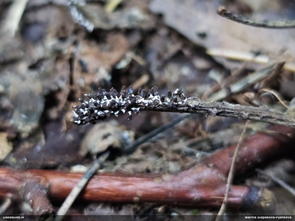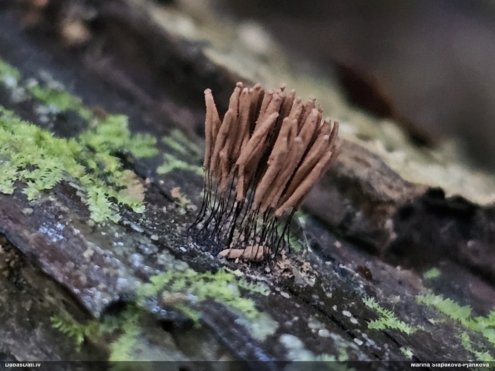 Vai tik nebūs medainā bumbulīte? Augļķermeņi vertikāli izstiepti, sporu mākonis ciešā klājienā.