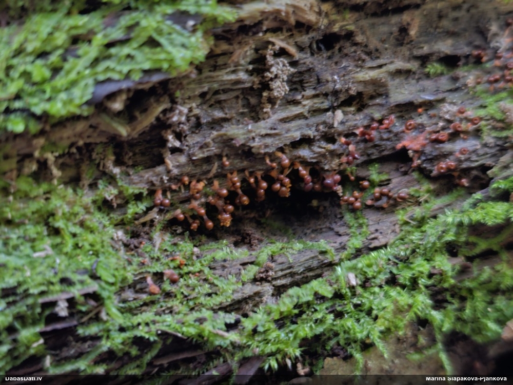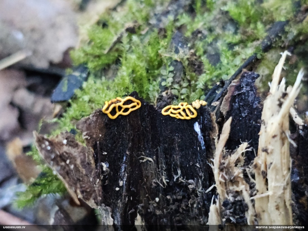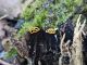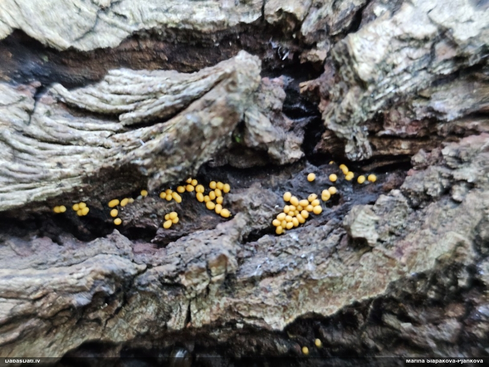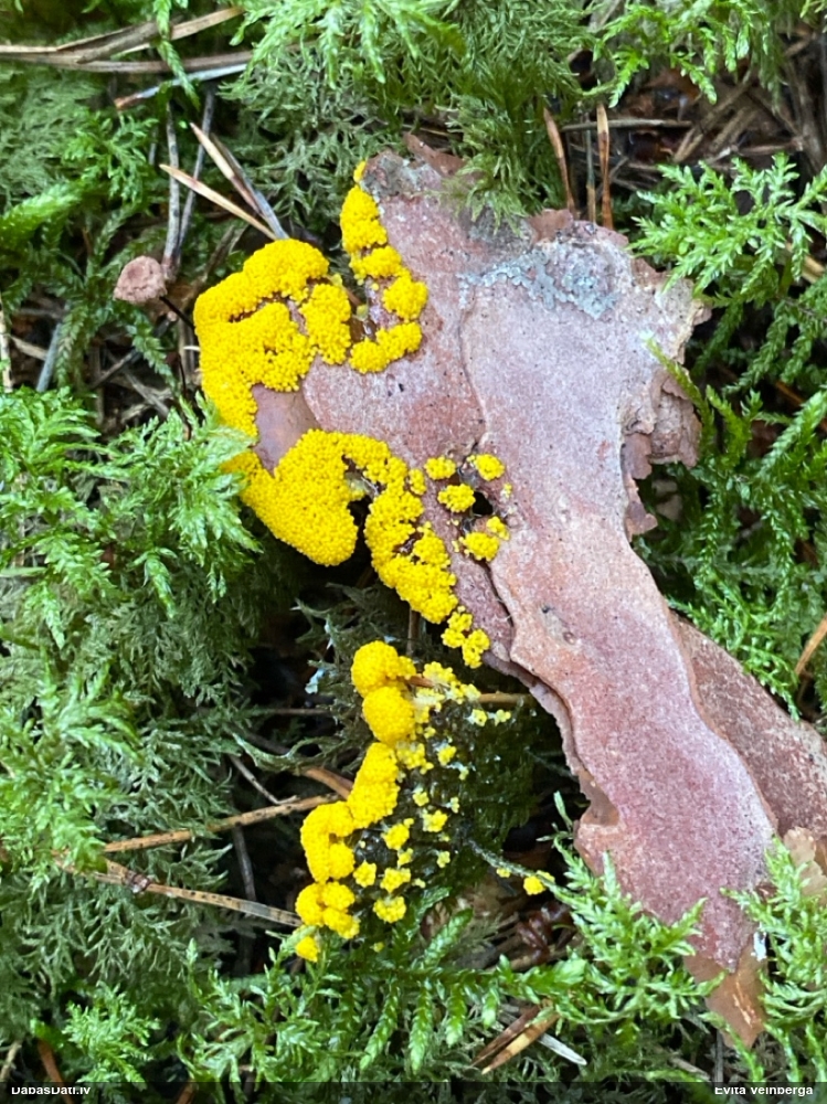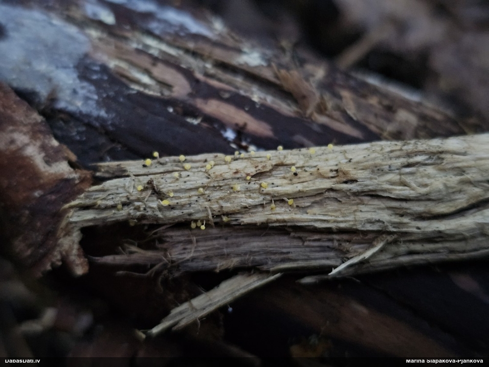 Man pēkšņi radās ideja - vai tur bija nu ļoti mitrs mikroklimats, egle ar melnalksni? Hipotētiski tādas dzeltenas var būt Diachea muscorum. Te bilde ir mazliet līdzīga: https://fr.wikipedia.org/wiki/Fichier:Craterium_muscorum,_Trawscoed,_North_Wales,_Aug_2016_-_Flickr_-_janetgraham84.jpg