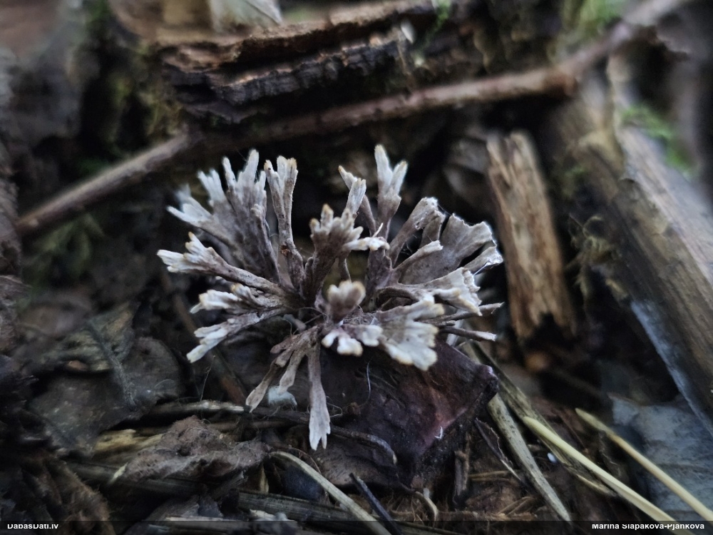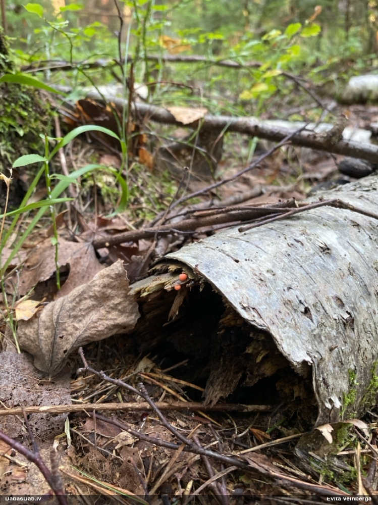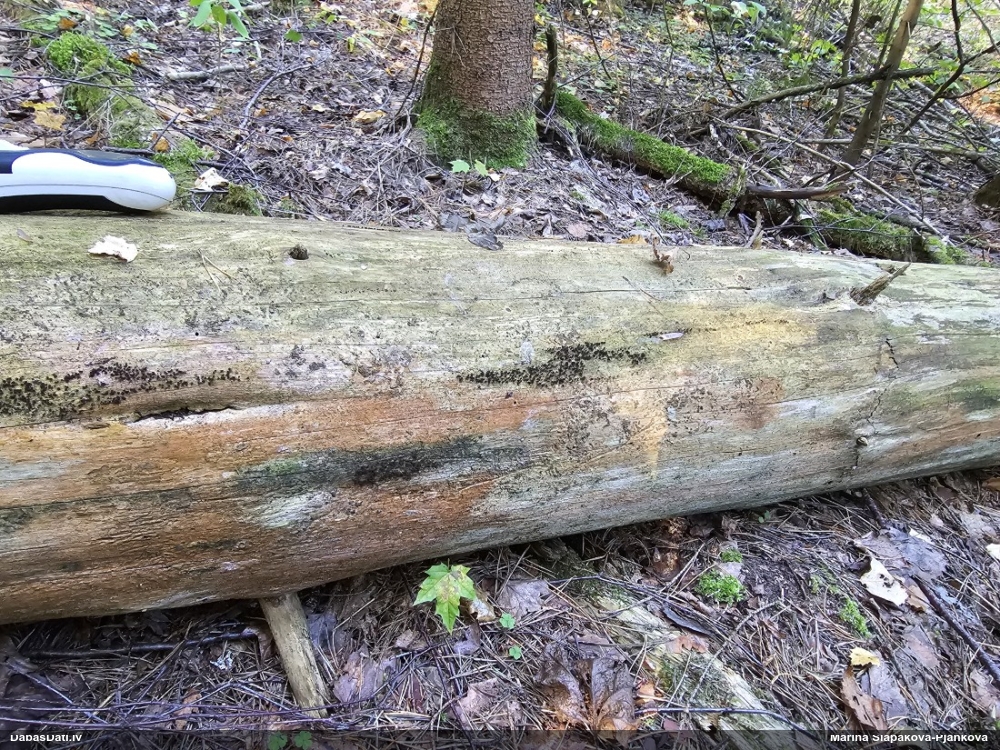 Satrūdējusi kritala mežā, nav dēļi. Iespējams, egle, jauktu koku mežs.