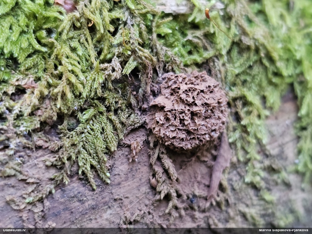Kaut kāda kūniņa, bet grūti saprast - jāredz tuvāk. Katrā ziņā ne tīkllapsenes kūniņa. Kur atradās? Zem mizas?