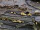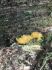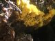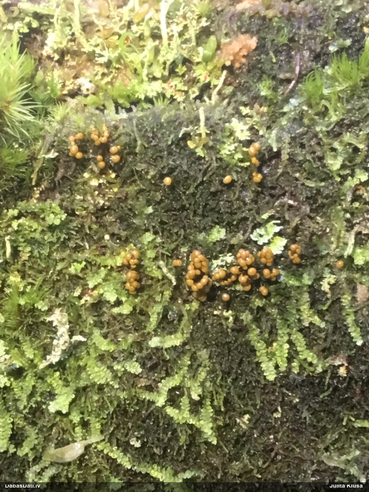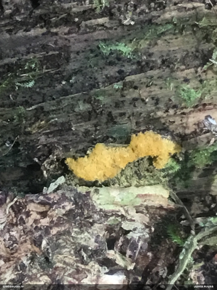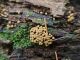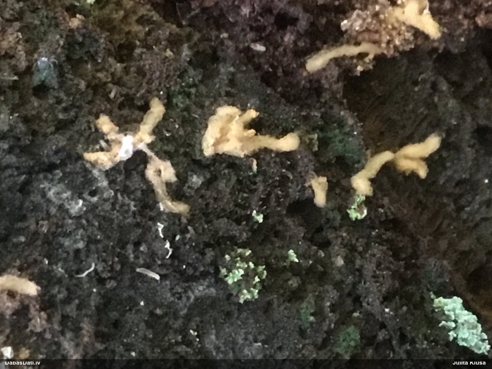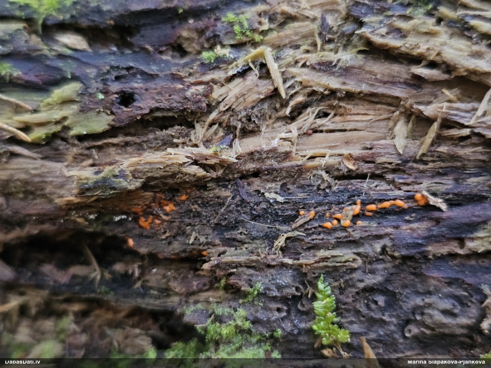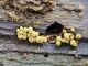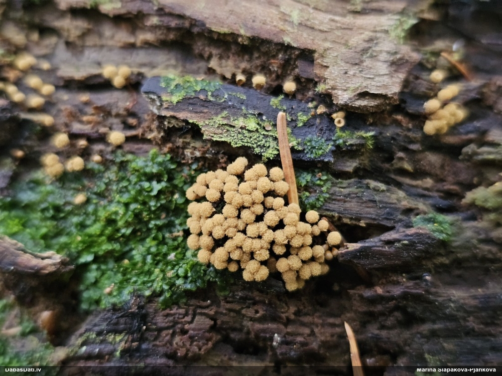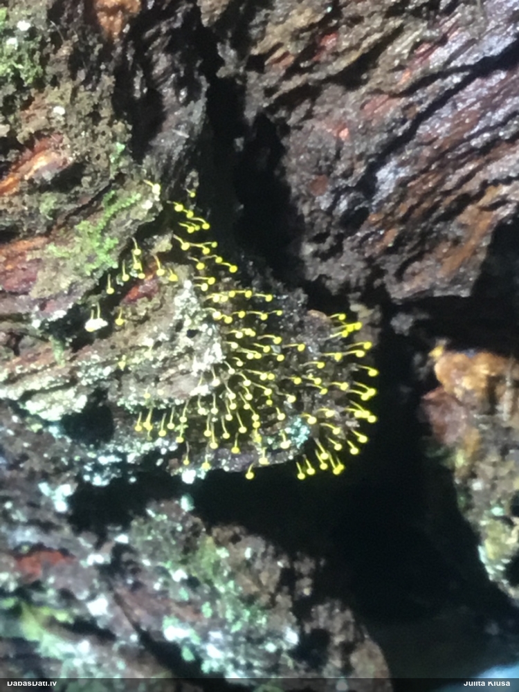 Man pēkšņi radās ideja - vai tur bija nu ļoti mitrs mikroklimats, egle ar melnalksni? Hipotētiski tādas dzeltenas var būt Diachea muscorum. Te bilde ir mazliet līdzīga: https://fr.wikipedia.org/wiki/Fichier:Craterium_muscorum,_Trawscoed,_North_Wales,_Aug_2016_-_Flickr_-_janetgraham84.jpg
