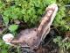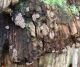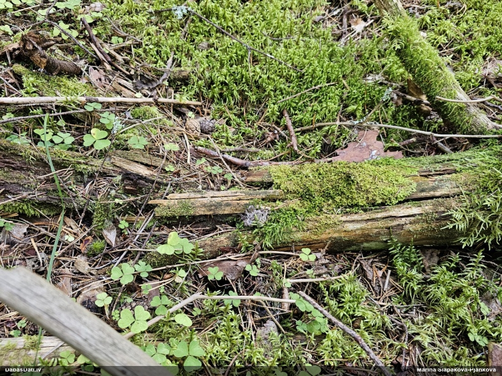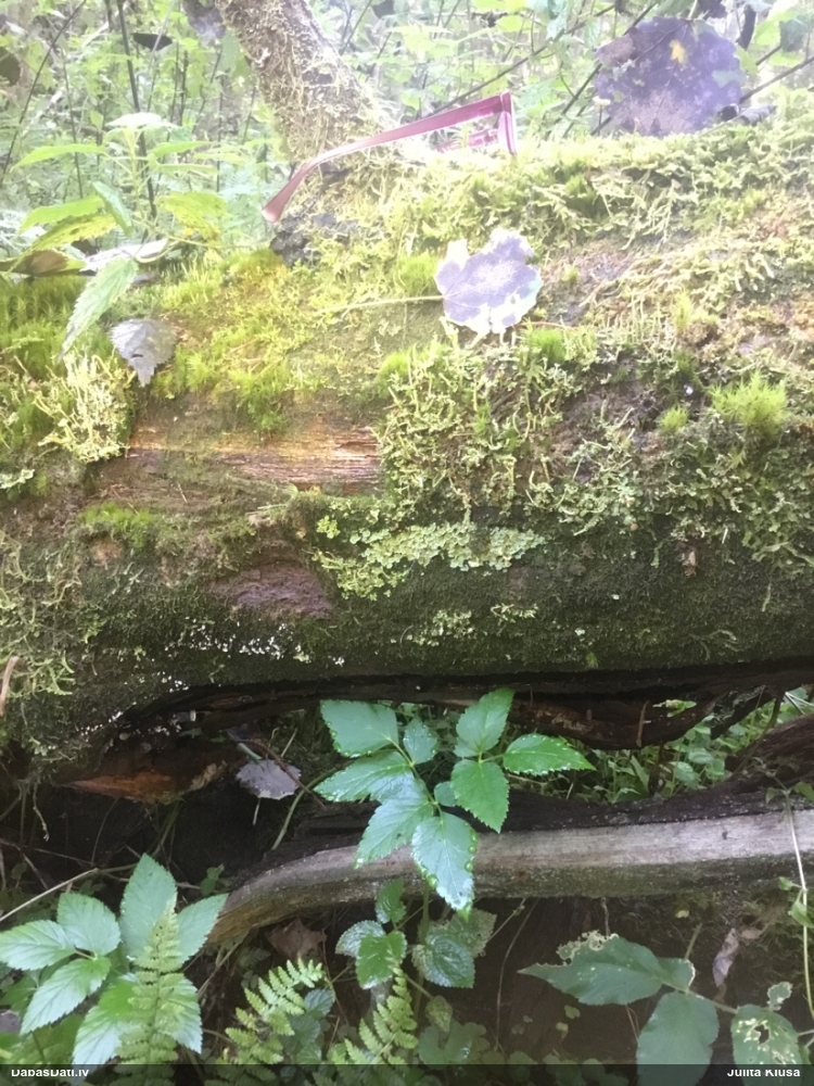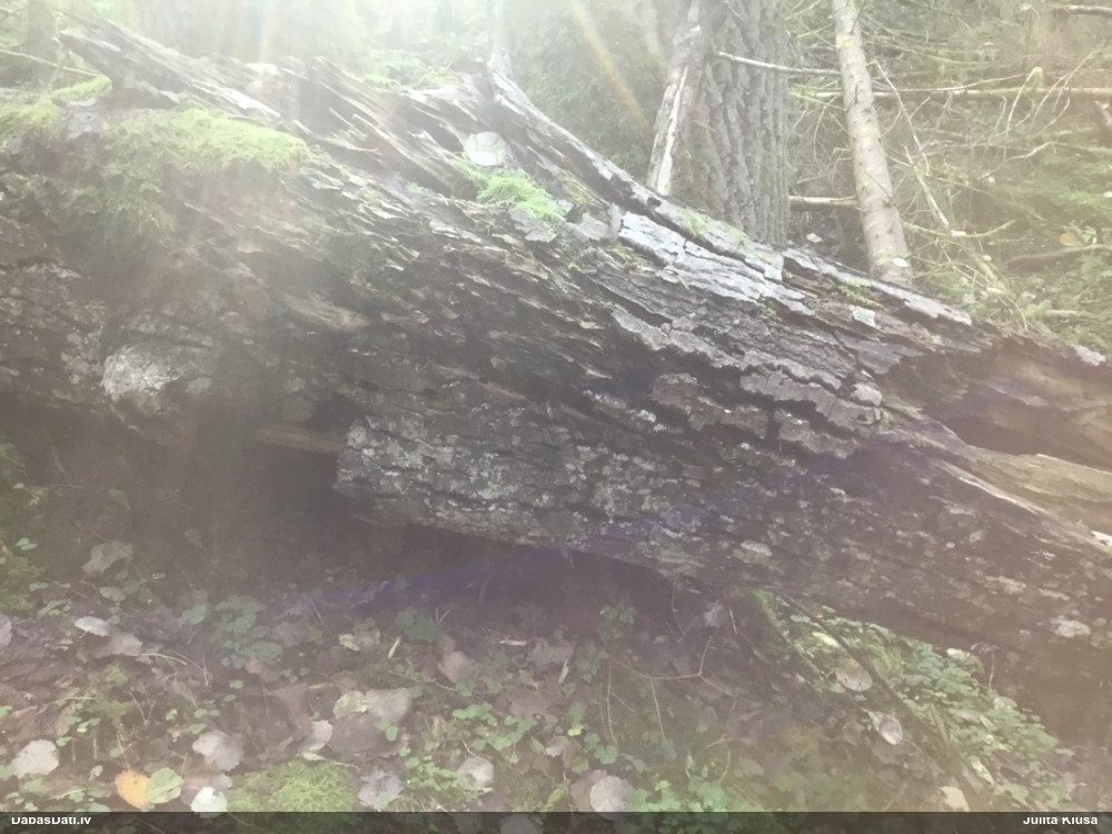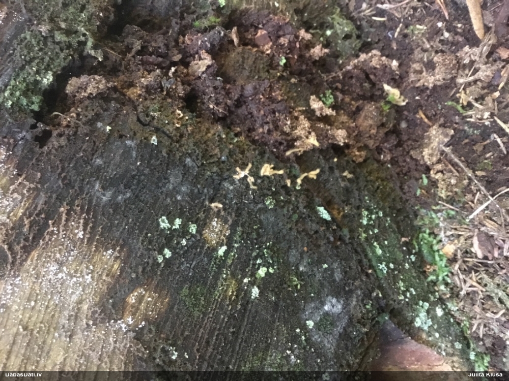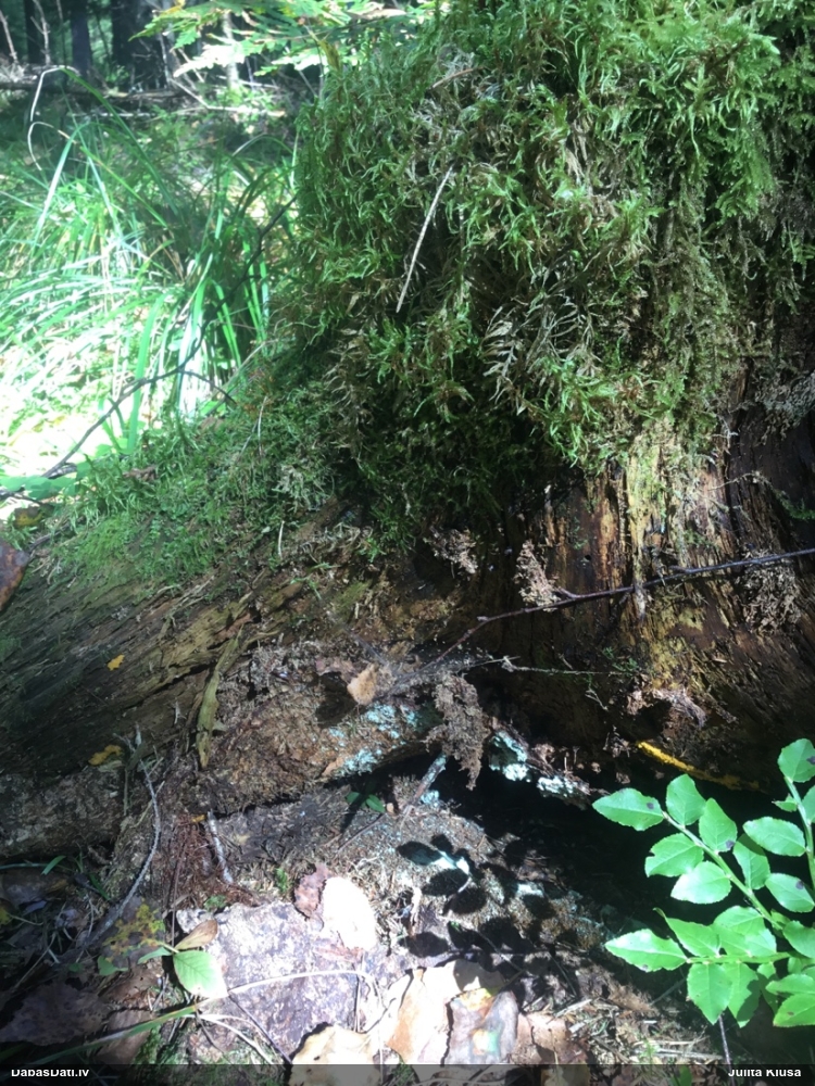 Satrūdējusi kritala mežā, nav dēļi. Iespējams, egle, jauktu koku mežs.