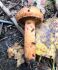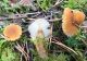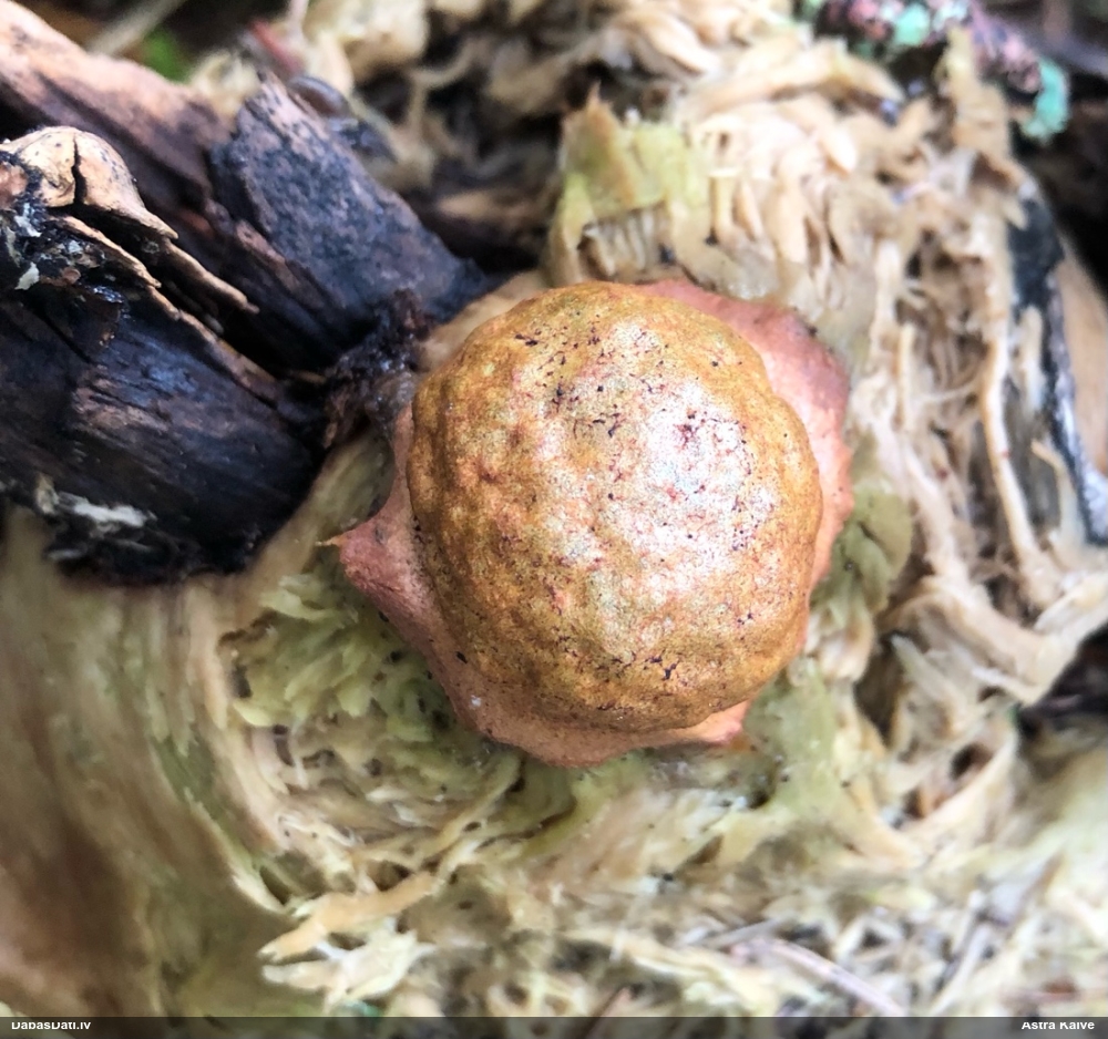Man pēkšņi radās ideja - vai tur bija nu ļoti mitrs mikroklimats, egle ar melnalksni? Hipotētiski tādas dzeltenas var būt Diachea muscorum. Te bilde ir mazliet līdzīga: https://fr.wikipedia.org/wiki/Fichier:Craterium_muscorum,_Trawscoed,_North_Wales,_Aug_2016_-_Flickr_-_janetgraham84.jpg