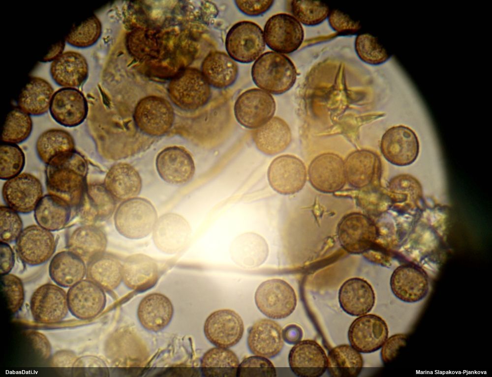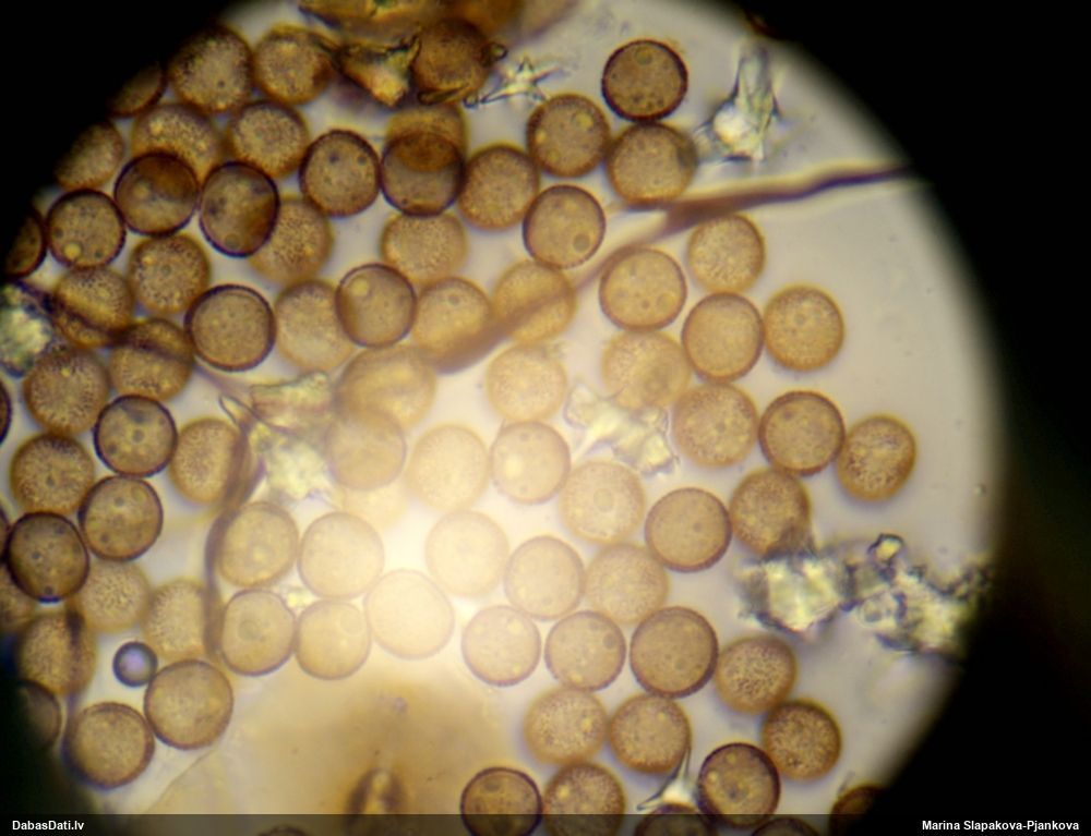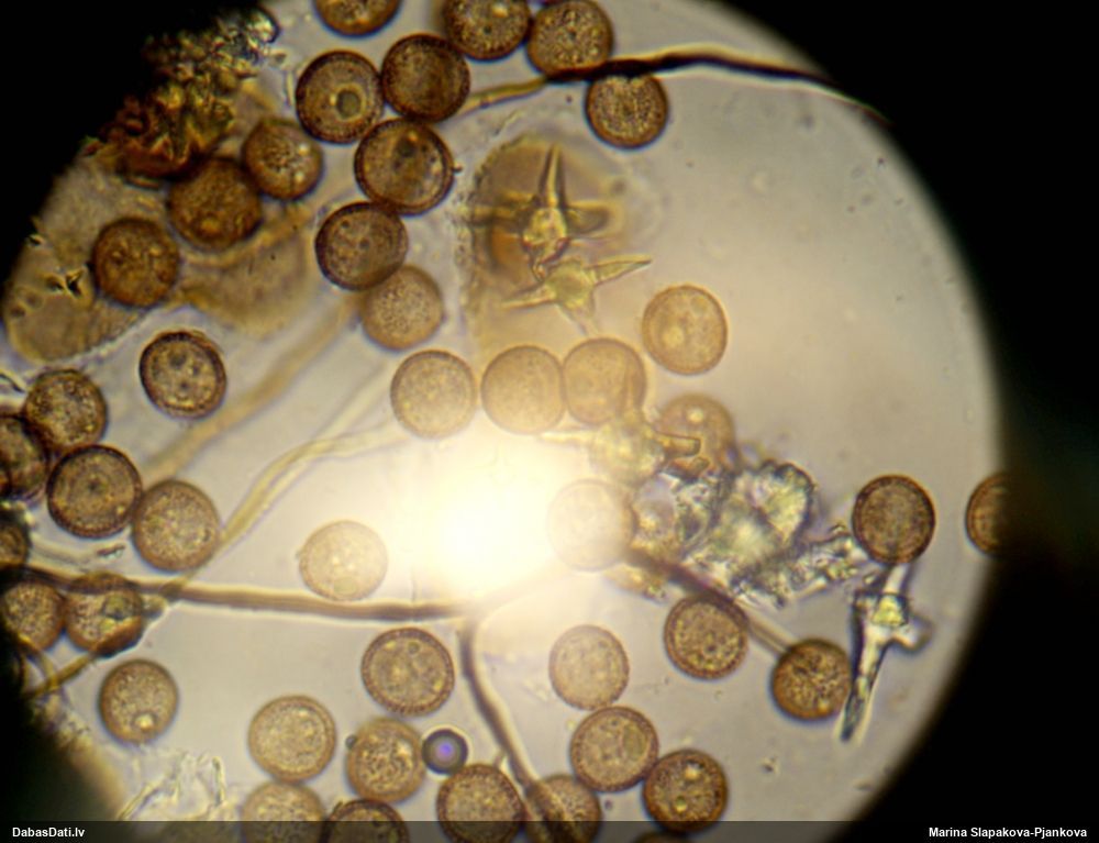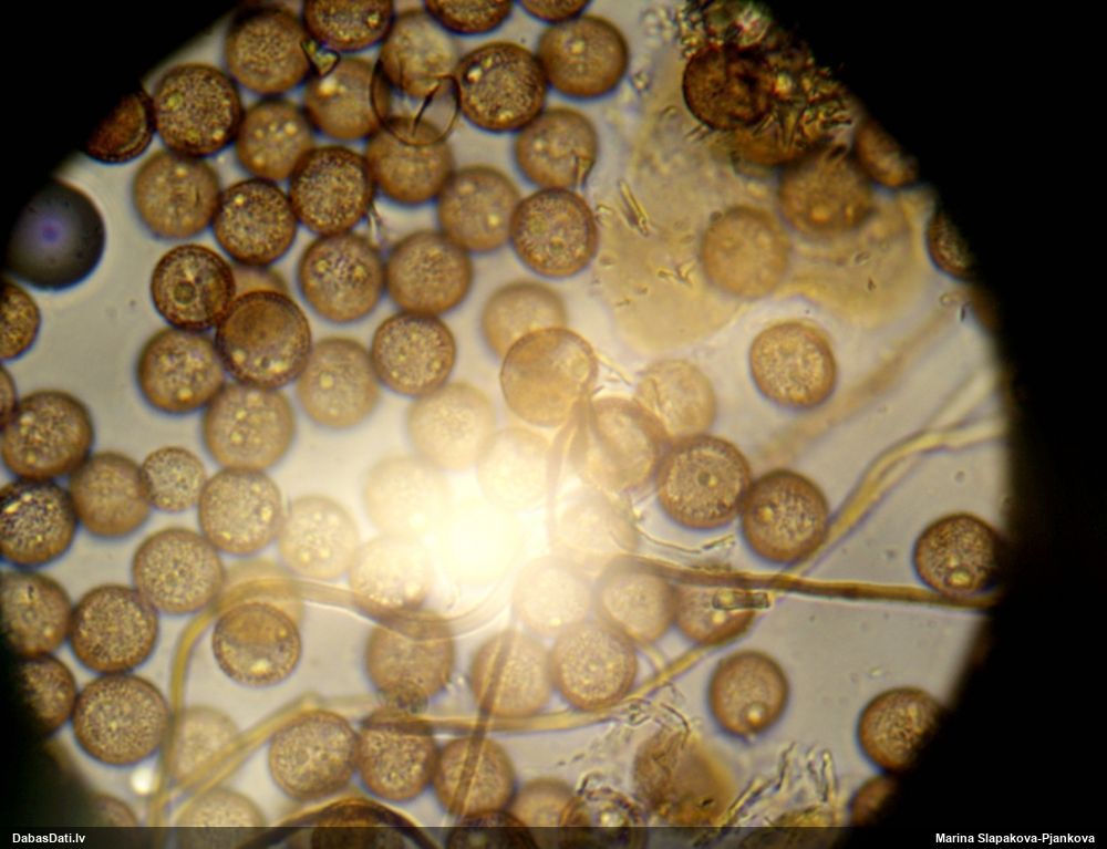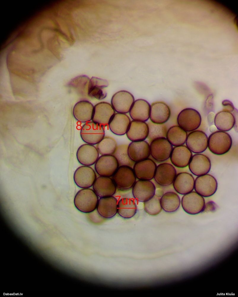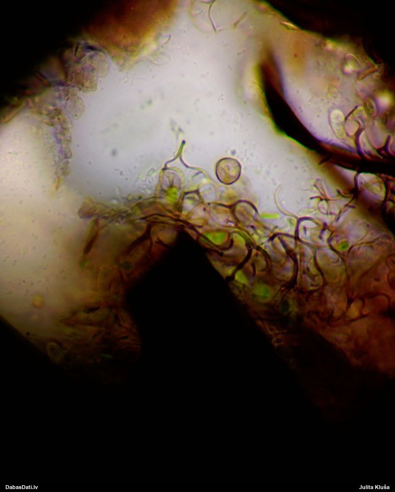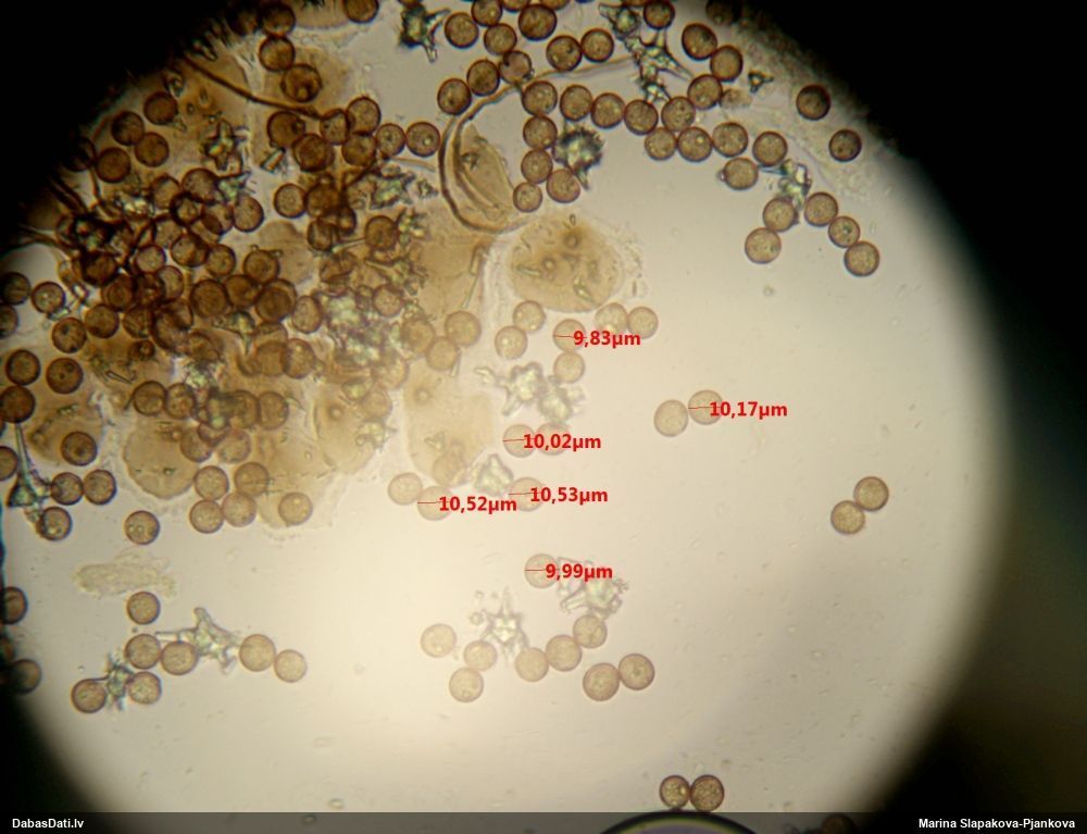 Sporas izskatās ļoti gaišas, varbūt nenobriedušas. Es laikam pēc kāda laiciņa mēģinātu vēlreiz mikroskopēt. Tajā pašā laikā sporu izmēri priekš T.contorta ir pamazi (ja tipiski ir 11-14 mkm, te ir knapi 11 mkm)