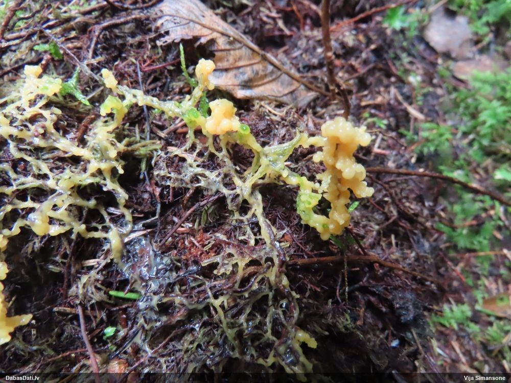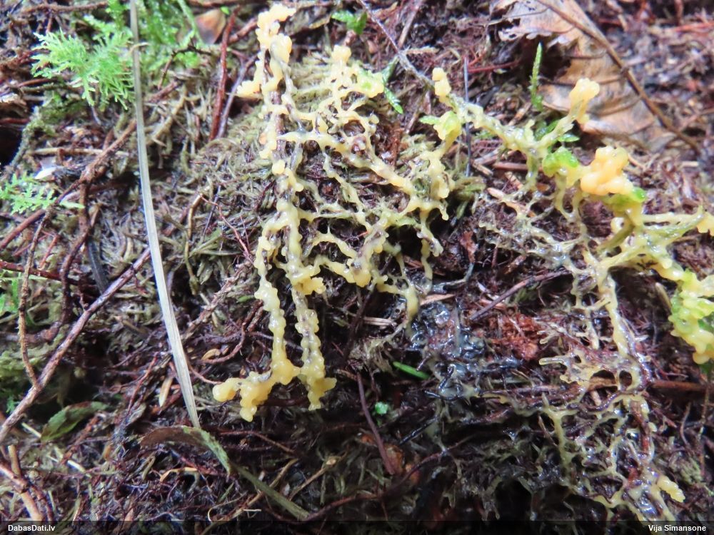 Man pēkšņi radās ideja - vai tur bija nu ļoti mitrs mikroklimats, egle ar melnalksni? Hipotētiski tādas dzeltenas var būt Diachea muscorum. Te bilde ir mazliet līdzīga: https://fr.wikipedia.org/wiki/Fichier:Craterium_muscorum,_Trawscoed,_North_Wales,_Aug_2016_-_Flickr_-_janetgraham84.jpg