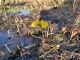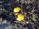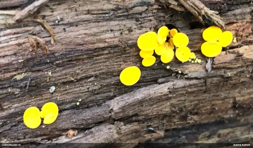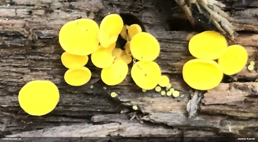 Man pēkšņi radās ideja - vai tur bija nu ļoti mitrs mikroklimats, egle ar melnalksni? Hipotētiski tādas dzeltenas var būt Diachea muscorum. Te bilde ir mazliet līdzīga: https://fr.wikipedia.org/wiki/Fichier:Craterium_muscorum,_Trawscoed,_North_Wales,_Aug_2016_-_Flickr_-_janetgraham84.jpg