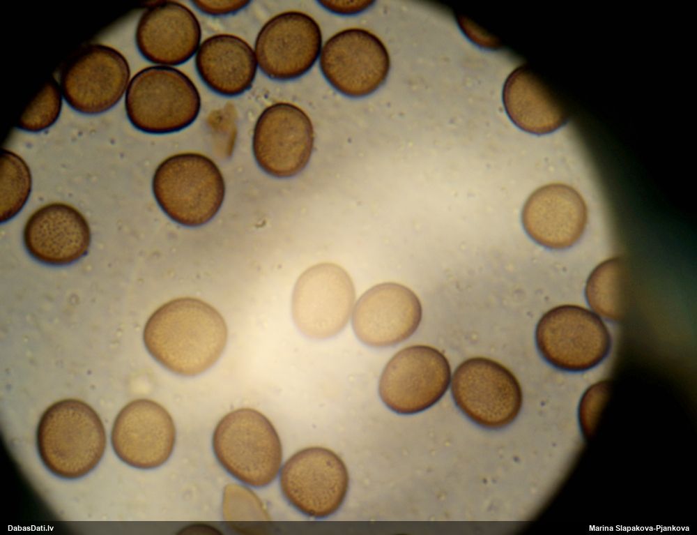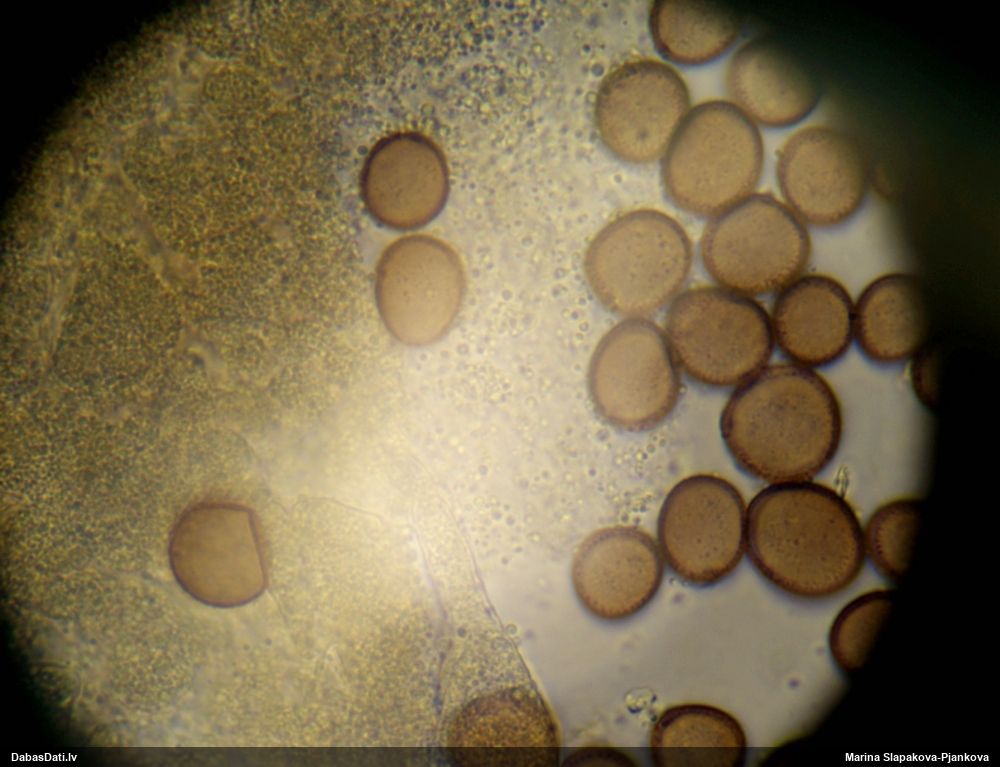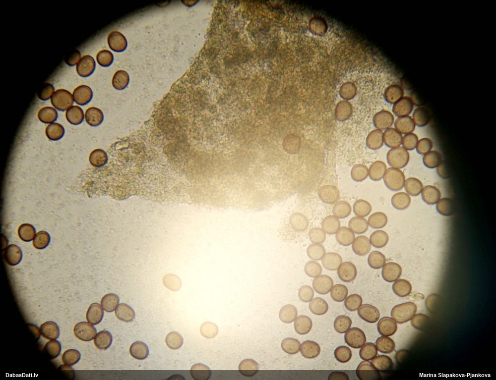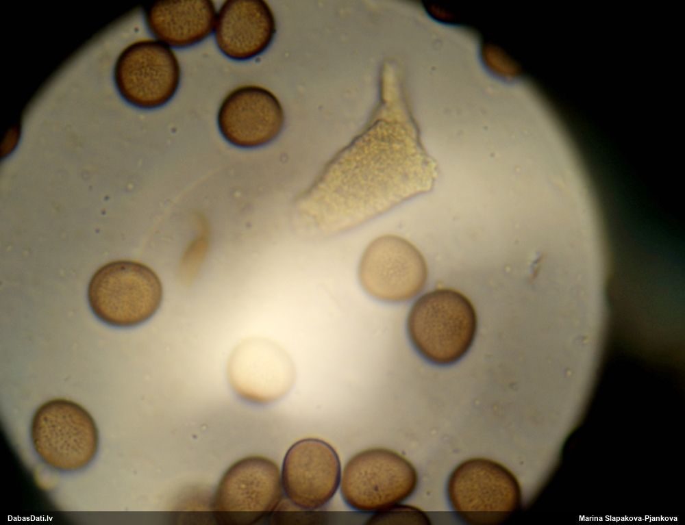 Sporas izskatās ļoti gaišas, varbūt nenobriedušas. Es laikam pēc kāda laiciņa mēģinātu vēlreiz mikroskopēt. Tajā pašā laikā sporu izmēri priekš T.contorta ir pamazi (ja tipiski ir 11-14 mkm, te ir knapi 11 mkm)