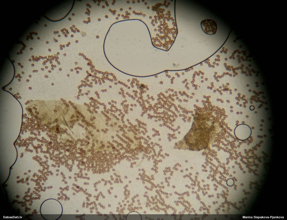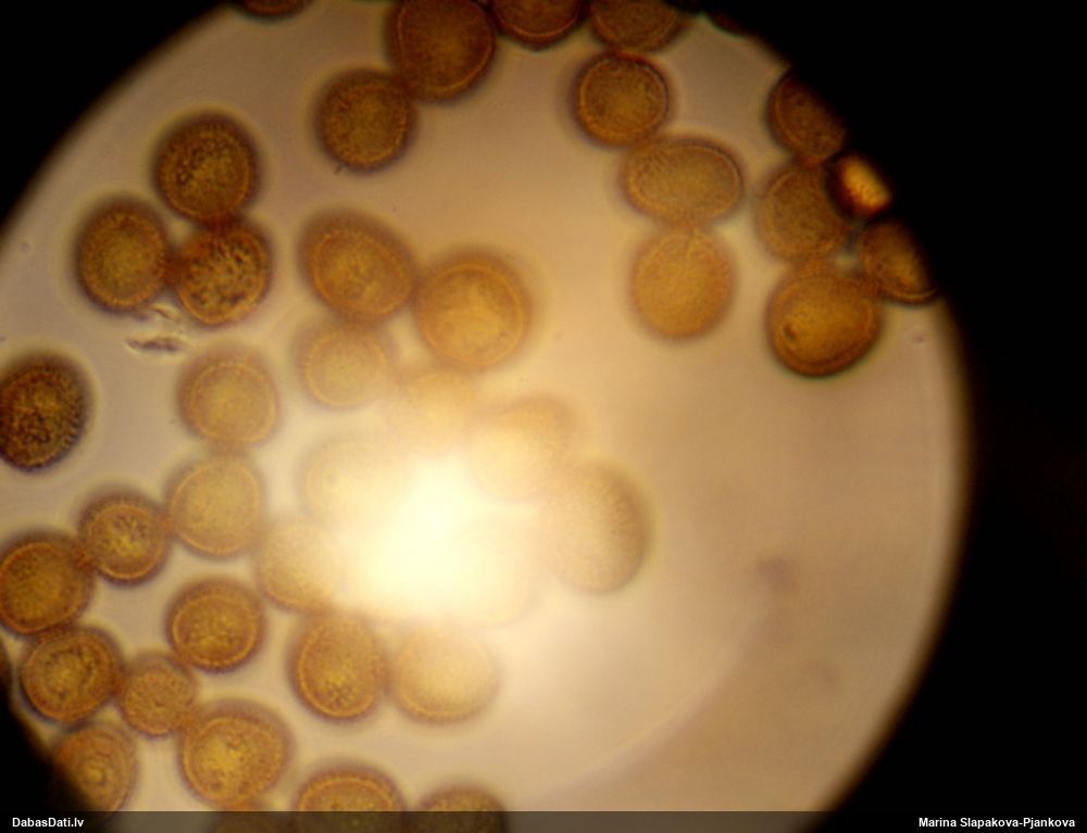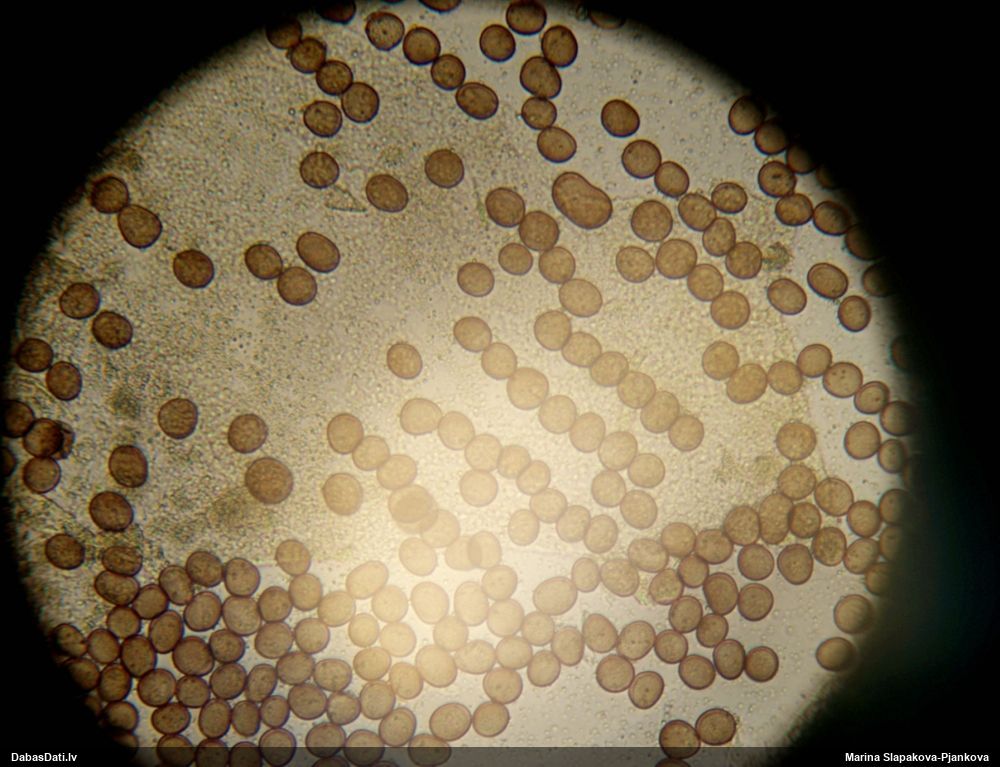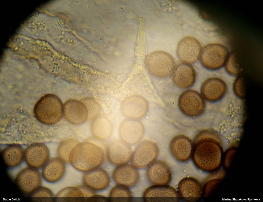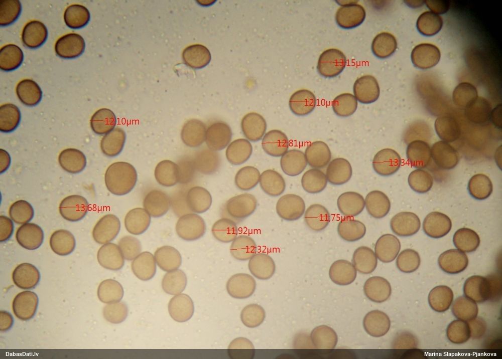 Sporas izskatās ļoti gaišas, varbūt nenobriedušas. Es laikam pēc kāda laiciņa mēģinātu vēlreiz mikroskopēt. Tajā pašā laikā sporu izmēri priekš T.contorta ir pamazi (ja tipiski ir 11-14 mkm, te ir knapi 11 mkm)