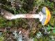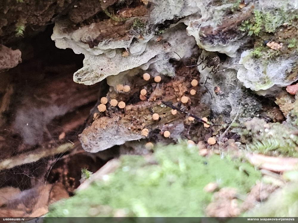 Man pēkšņi radās ideja - vai tur bija nu ļoti mitrs mikroklimats, egle ar melnalksni? Hipotētiski tādas dzeltenas var būt Diachea muscorum. Te bilde ir mazliet līdzīga: https://fr.wikipedia.org/wiki/Fichier:Craterium_muscorum,_Trawscoed,_North_Wales,_Aug_2016_-_Flickr_-_janetgraham84.jpg
