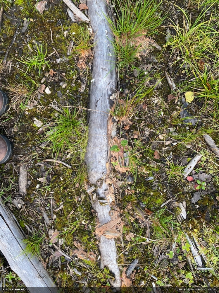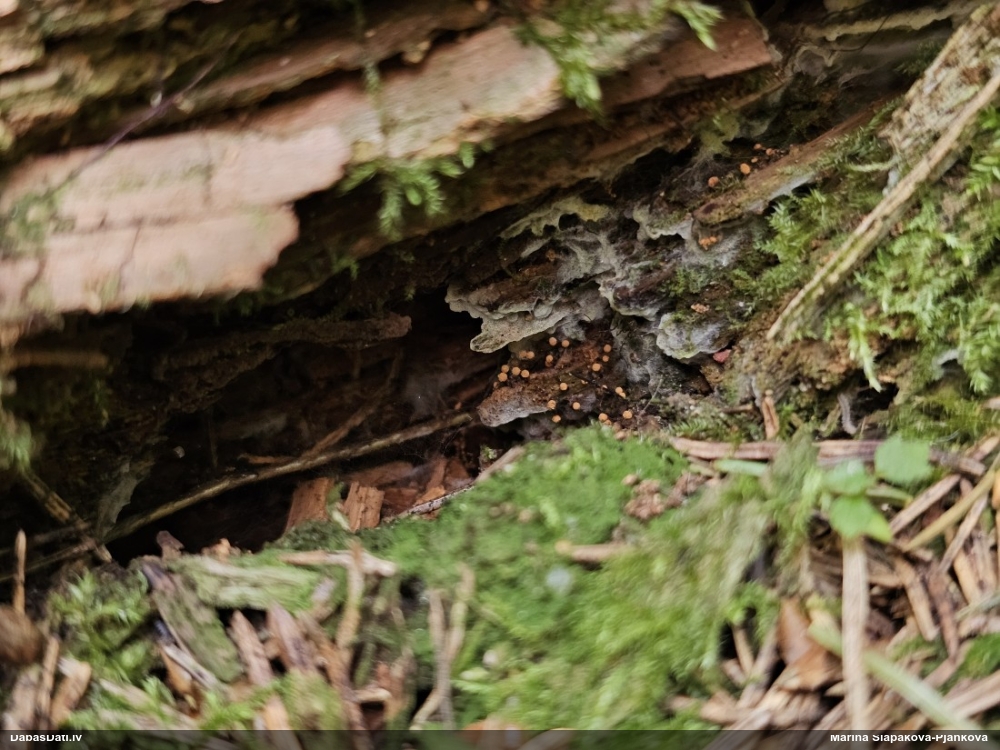 Satrūdējusi kritala mežā, nav dēļi. Iespējams, egle, jauktu koku mežs.