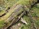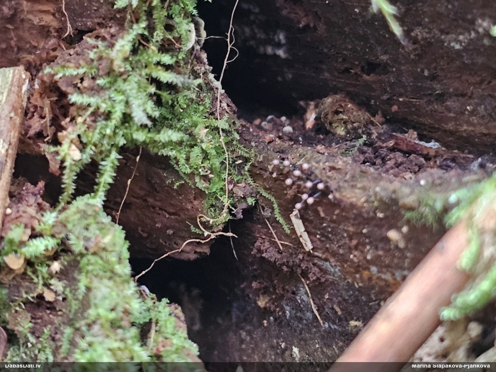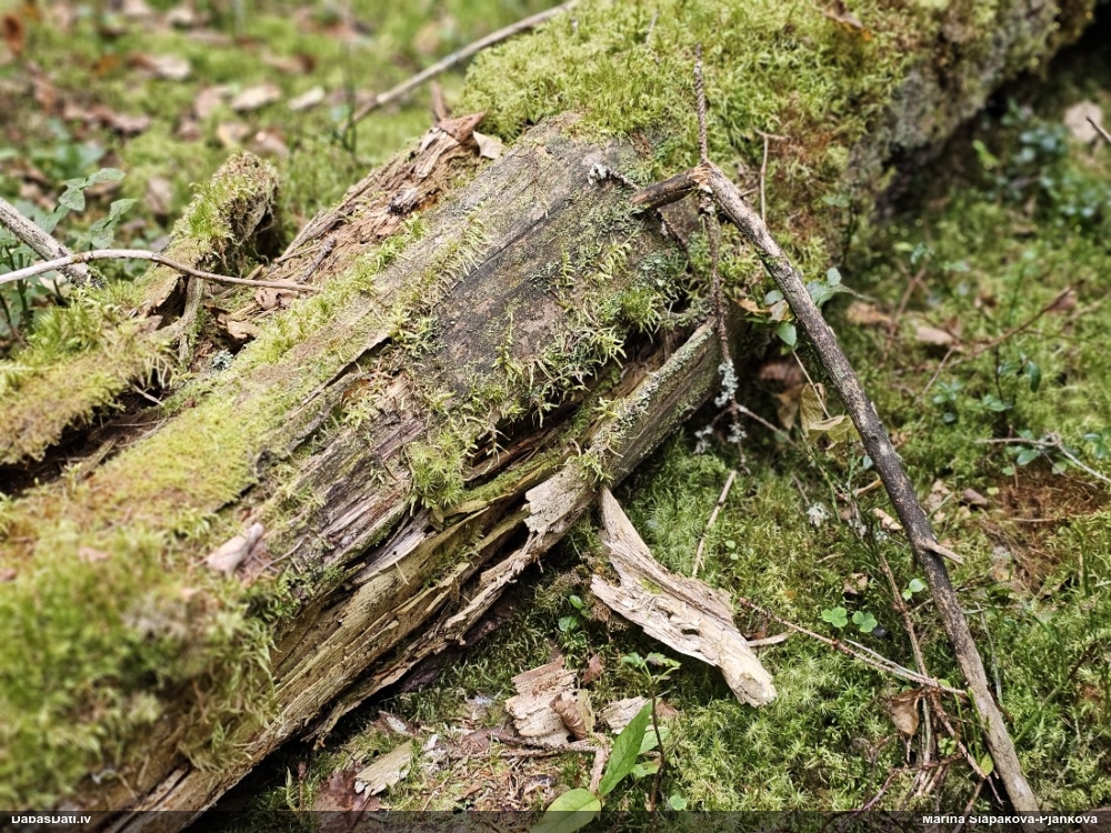 Satrūdējusi kritala mežā, nav dēļi. Iespējams, egle, jauktu koku mežs.
