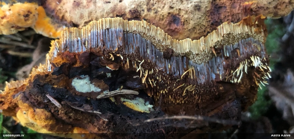 Liels paldies par paraugu! Mikroskopēju, viss kārtībā, kapilīcijs ir un suga pareiza. :) Un kā jau ir gadījies - tikko saņemu un apskatu paraugu, tā uzreiz ekspedīcijā izdodas atrast arī pašai (1 gab. augļķermeni :D). Ir pilnīgi droši, Raivo, bez Tava atraduma es arī nebūtu atradusi, jo uzmanību pievērsu, ka egle bija tieši tāda pati - slīpa un melna, tāpēc īpašs paldies par biotopa un substrāta bildēm! Kad ieraudzīju koka atbilstību, tad meklēju, kamēr atradu. :)