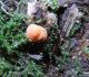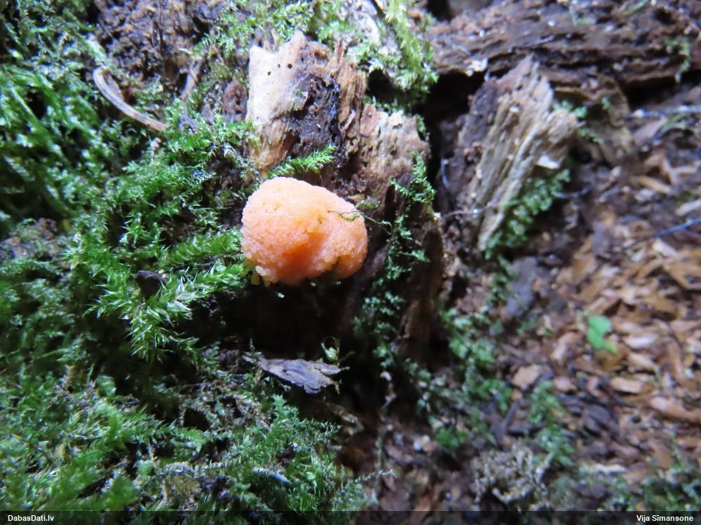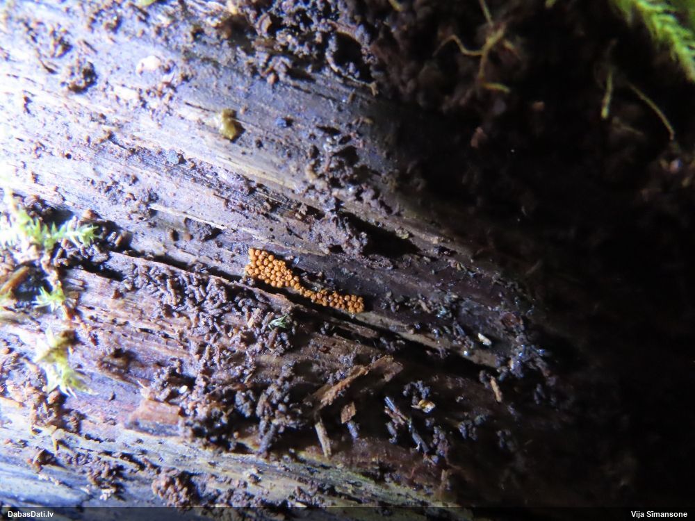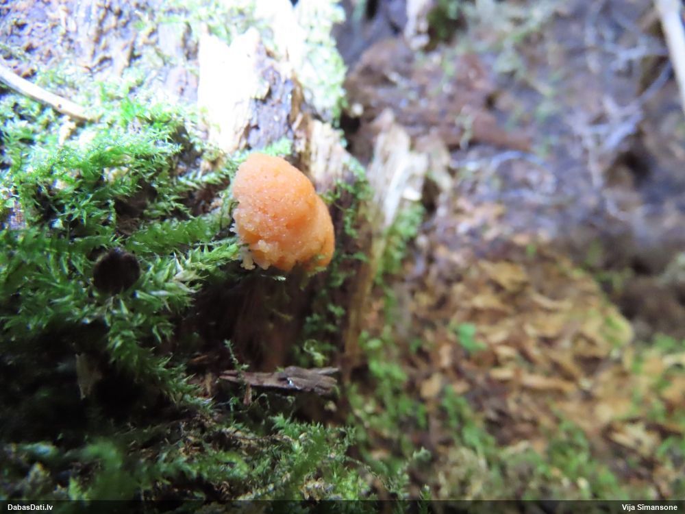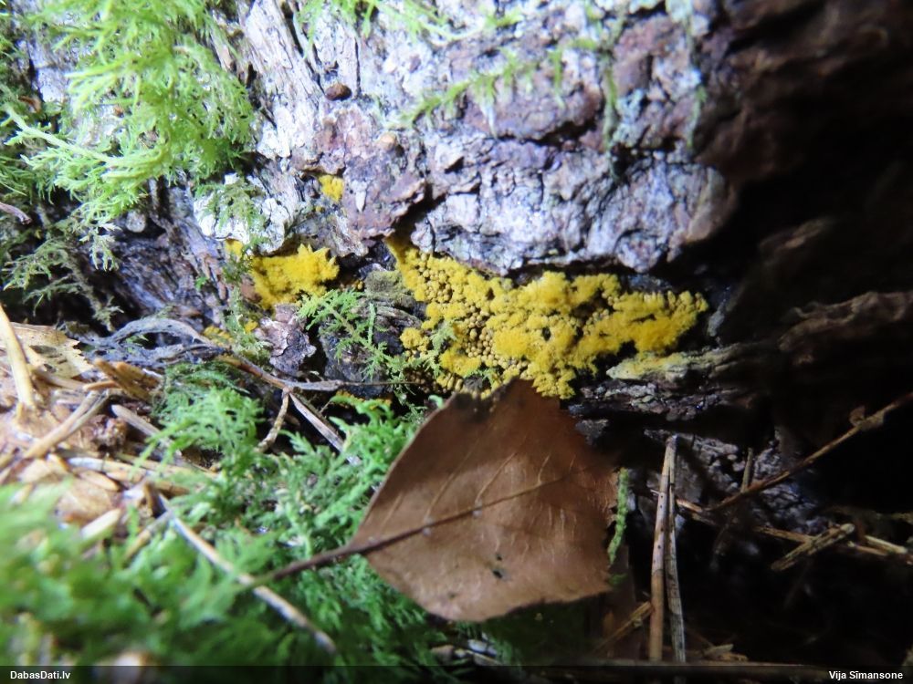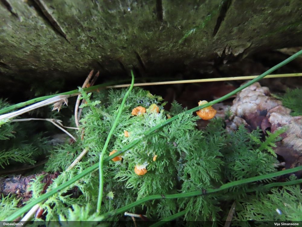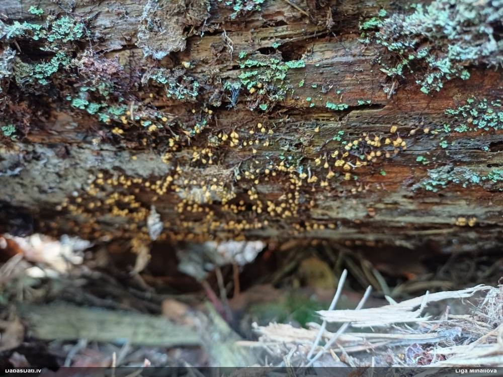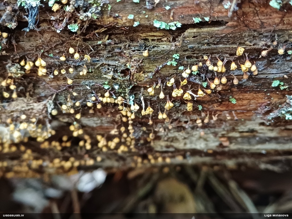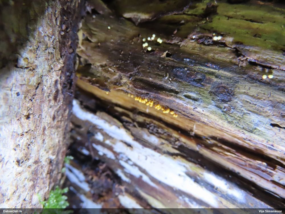 Man pēkšņi radās ideja - vai tur bija nu ļoti mitrs mikroklimats, egle ar melnalksni? Hipotētiski tādas dzeltenas var būt Diachea muscorum. Te bilde ir mazliet līdzīga: https://fr.wikipedia.org/wiki/Fichier:Craterium_muscorum,_Trawscoed,_North_Wales,_Aug_2016_-_Flickr_-_janetgraham84.jpg